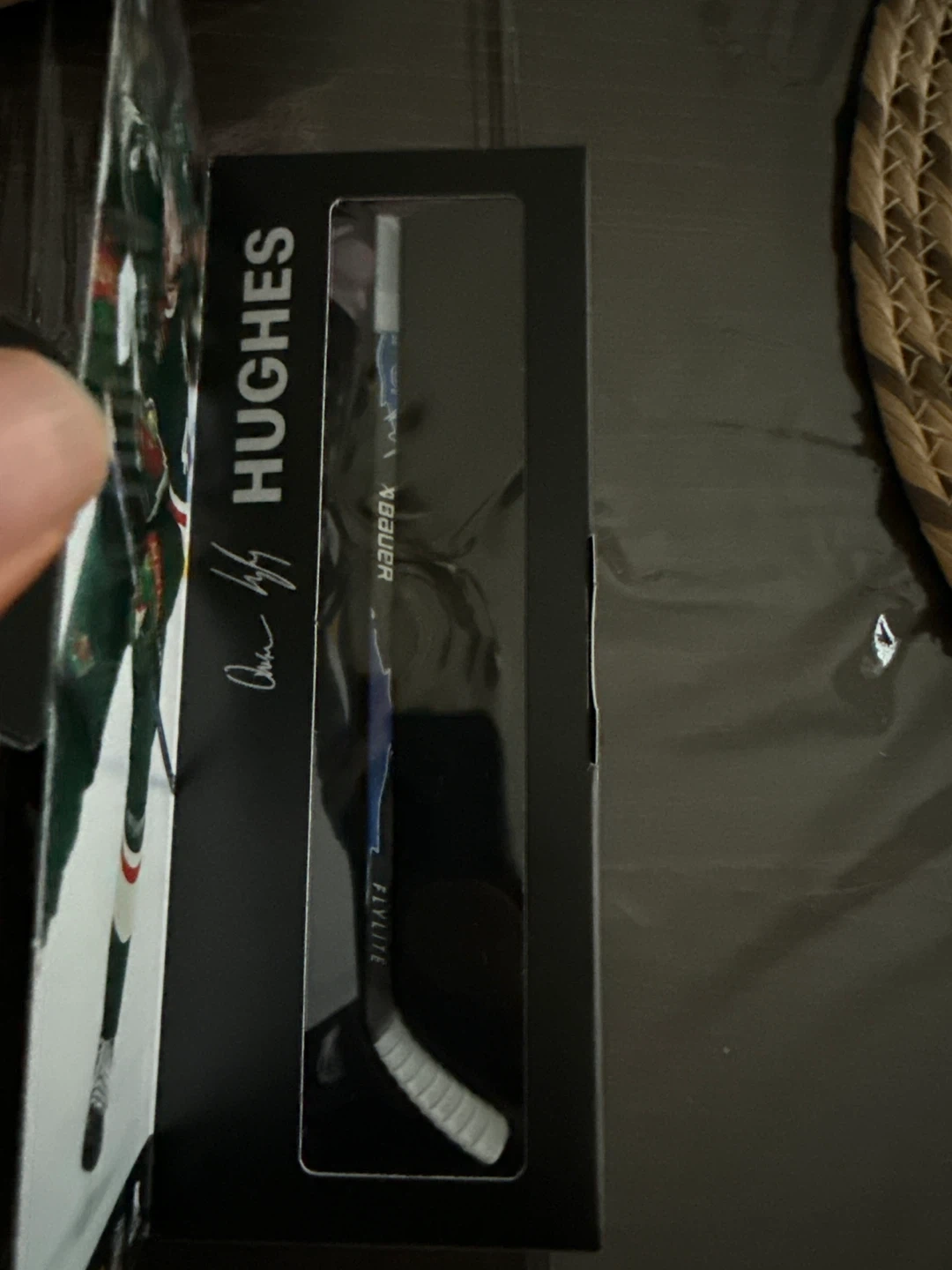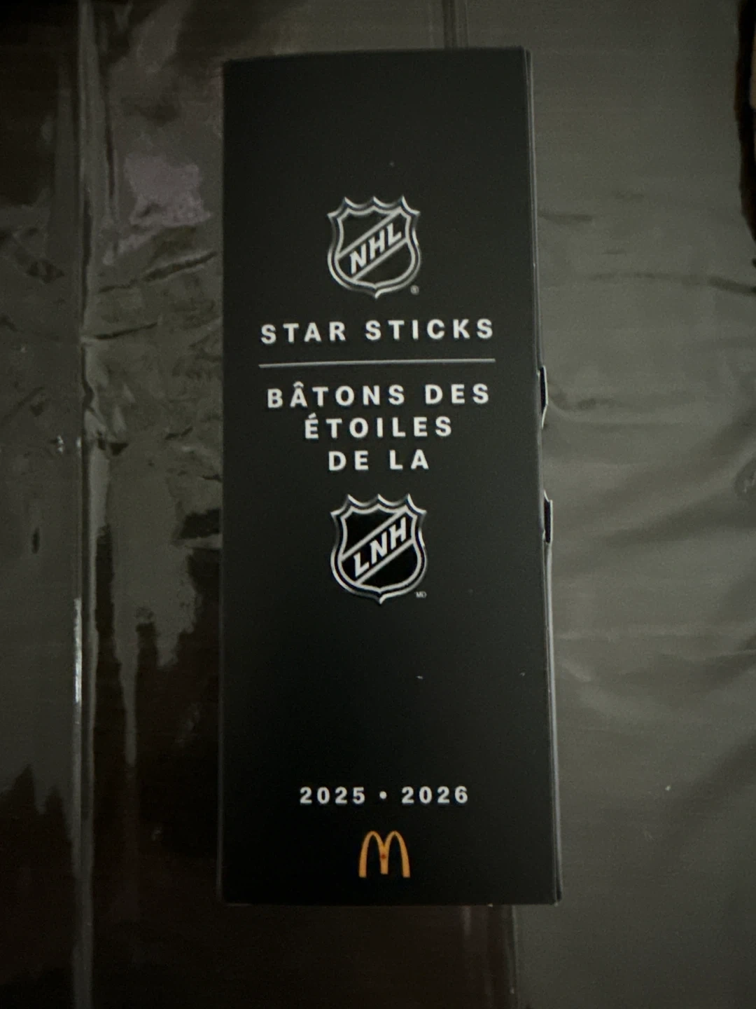 This is a "Hughes" mini hockey stick, part of the McDonald's Star Sticks promotion. It's a collectible item from the 2025-2026 season. The stick comes in its original packaging with a picture of the player.