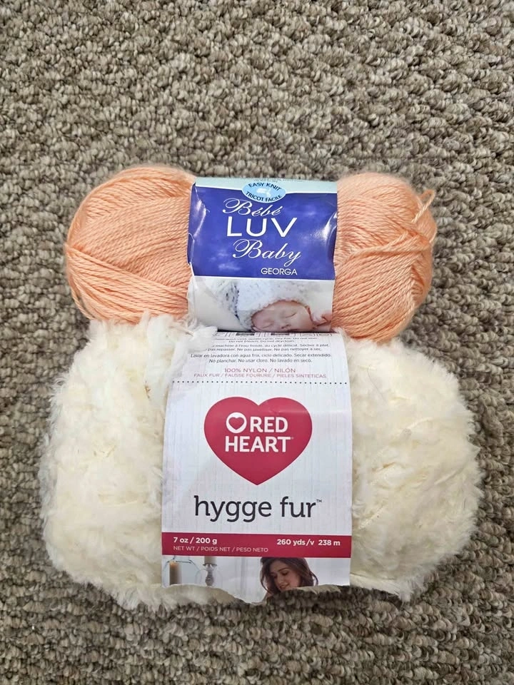 Soft yarn for your next project! This listing has two brand new skeins of yarn. One is Red Heart Hygge Fur in off-white, The other is Bebe Luv Baby yarn in a light peach color. Selling together only.