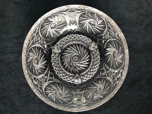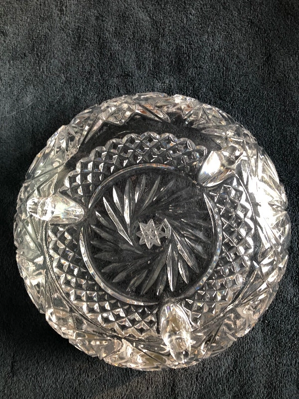 Vintage pinwheel crystal round bowl with 3 small feet on base. Heavy, solid. Approximately 8.5” diameter x 4.25” height. In good condition, no chips, cracks. Pickup in Brampton, near Queen and Kennedy.