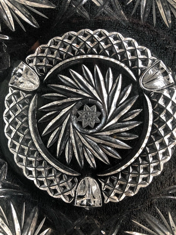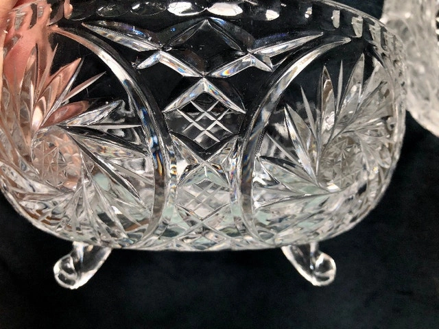 Vintage pinwheel crystal round bowl with 3 small feet on base. Heavy, solid. Approximately 8.5” diameter x 4.25” height. In good condition, no chips, cracks. Pickup in Brampton, near Queen and Kennedy.