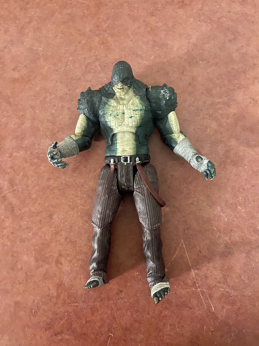 This is a DC Comics Killer Croc action figure. It's a collectible toy with detailed sculpting and articulation. The figure has a dark green scaly texture and wears pinstripe pants with a belt. It's suitable for display or play.