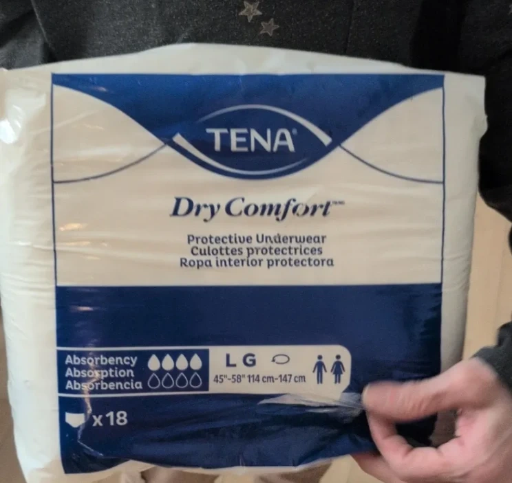 TENA Dry Comfort Protective Underwear in size Large. These come in a pack of 18. Designed for absorbency. Box of 16 of packs
