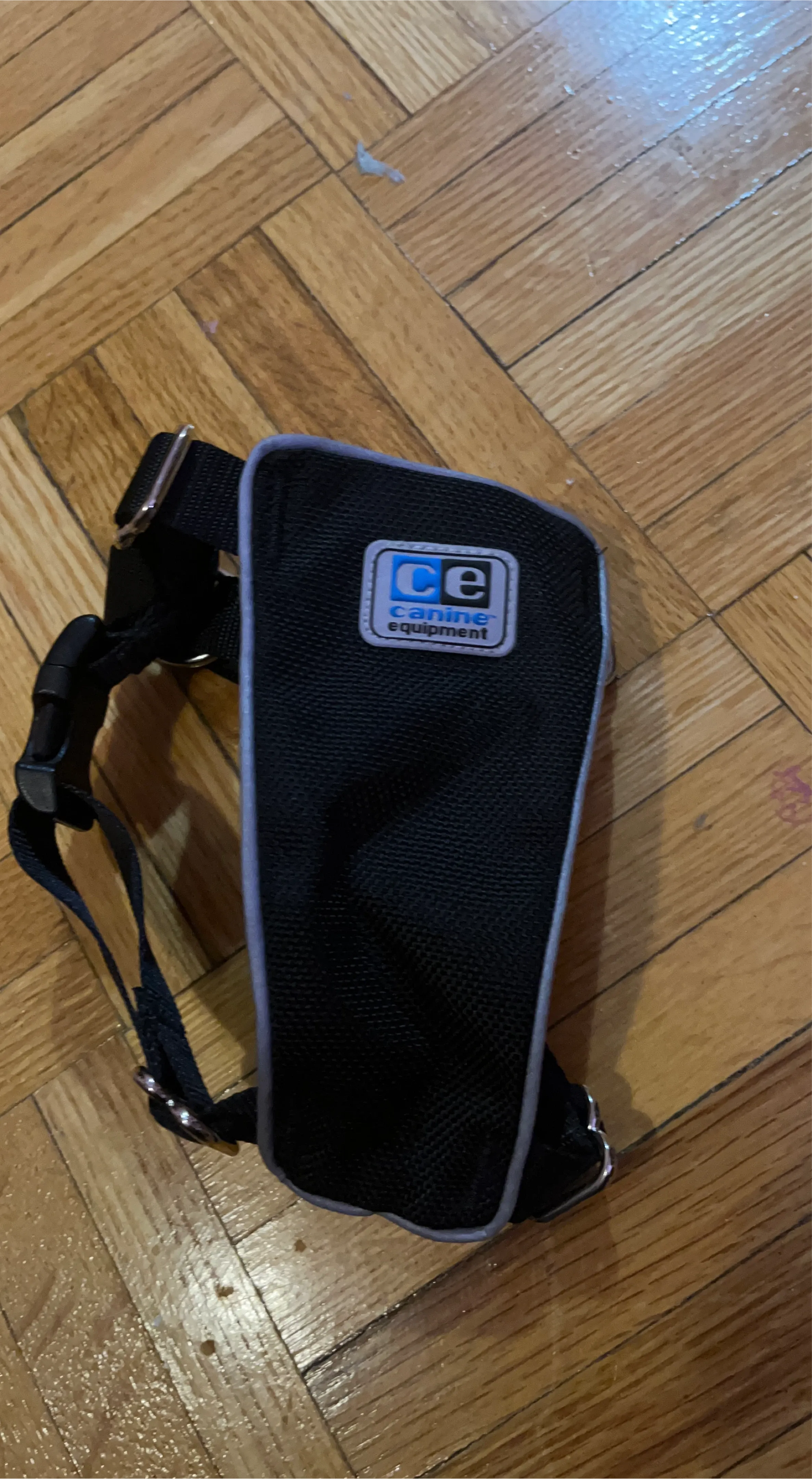 This is a black muzzle from CE Canine Equipment. It's made of durable nylon material with adjustable straps for a secure fit. This muzzle is designed to prevent biting while still allowing your dog to pant and drink.