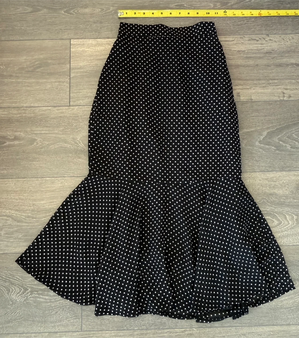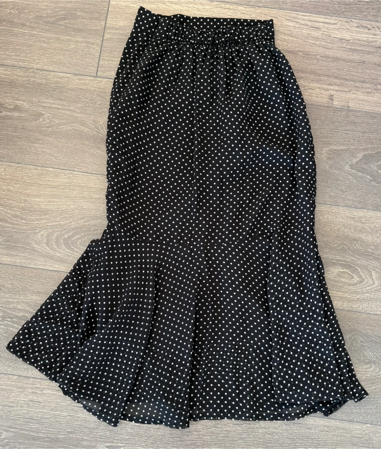 Cute black and white polka dot skirt with a ruffle hem! It's in great condition and ready for a new home. The fabric is lightweight and flowy, perfect for warmer weather