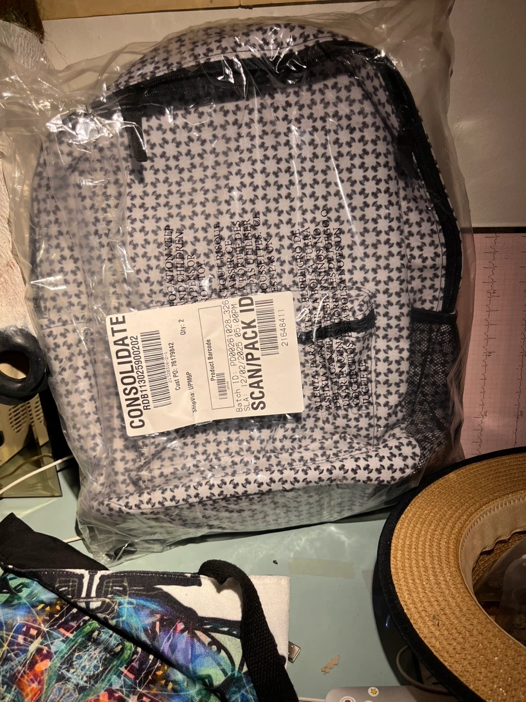 This backpack features a black and white houndstooth-like pattern all over. It's new and still in its original packaging, perfect for everyday use. Comes with a main compartment and a front pocket. Designed and sold by Mkicrattzzi Scuvgurt (me) I originally bought this backpack for a Christmas present that I didn’t send because I didn’t think my cousin would like it cause it’s mushrooms and shes super straight edge do you think it’s a corny backpack? The pattern is pretty cool. It does look like hounds tooth and actually kind of looks like woven printed lace or something but they are tiny mushrooms. Anyway its here with me in packaging and Im seeling it for less than the listed price in my redbubble shop.