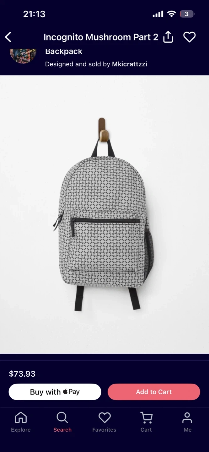 This backpack features a black and white houndstooth-like pattern all over. It's new and still in its original packaging, perfect for everyday use. Comes with a main compartment and a front pocket. Designed and sold by Mkicrattzzi Scuvgurt (me) I originally bought this backpack for a Christmas present that I didn’t send because I didn’t think my cousin would like it cause it’s mushrooms and shes super straight edge do you think it’s a corny backpack? The pattern is pretty cool. It does look like hounds tooth and actually kind of looks like woven printed lace or something but they are tiny mushrooms. Anyway its here with me in packaging and Im seeling it for less than the listed price in my redbubble shop.
