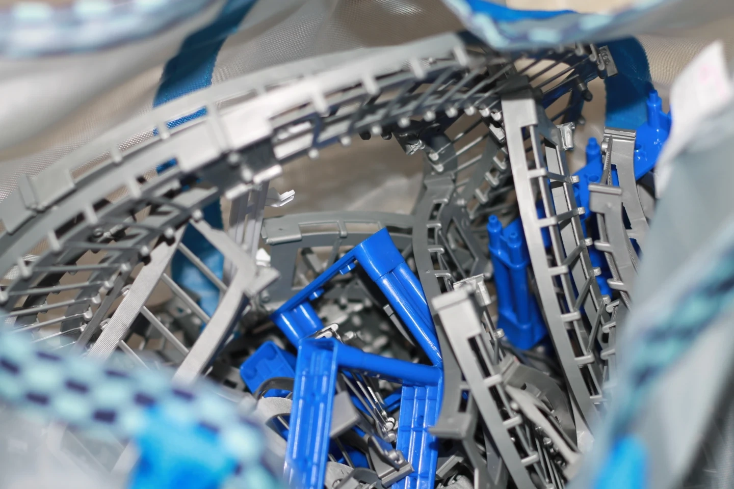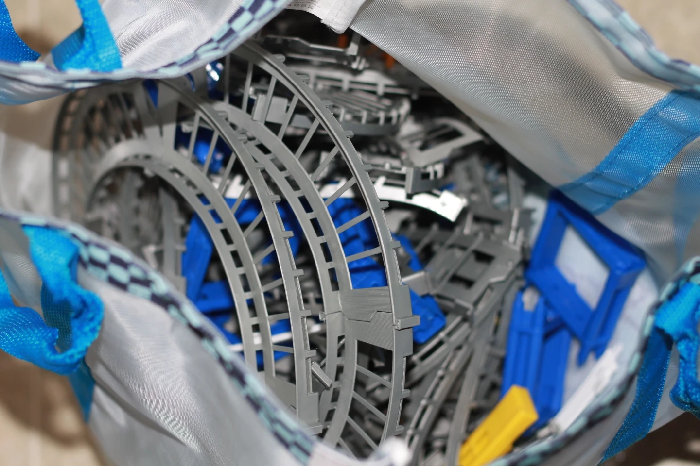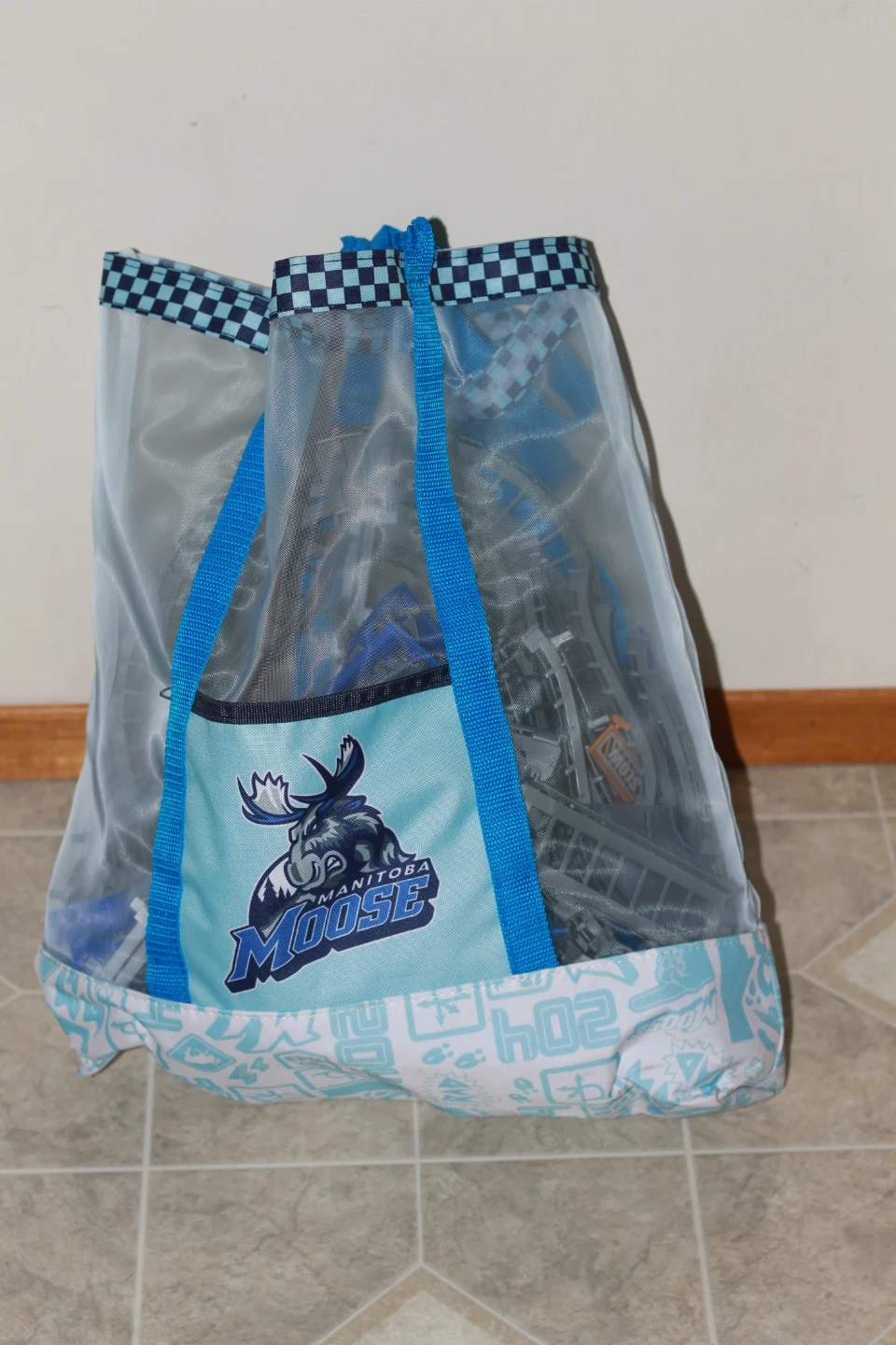 Mesh toy bag featuring the Manitoba Moose logo. It's filled with grey and blue plastic track pieces for building. Great for storing and transporting toys!