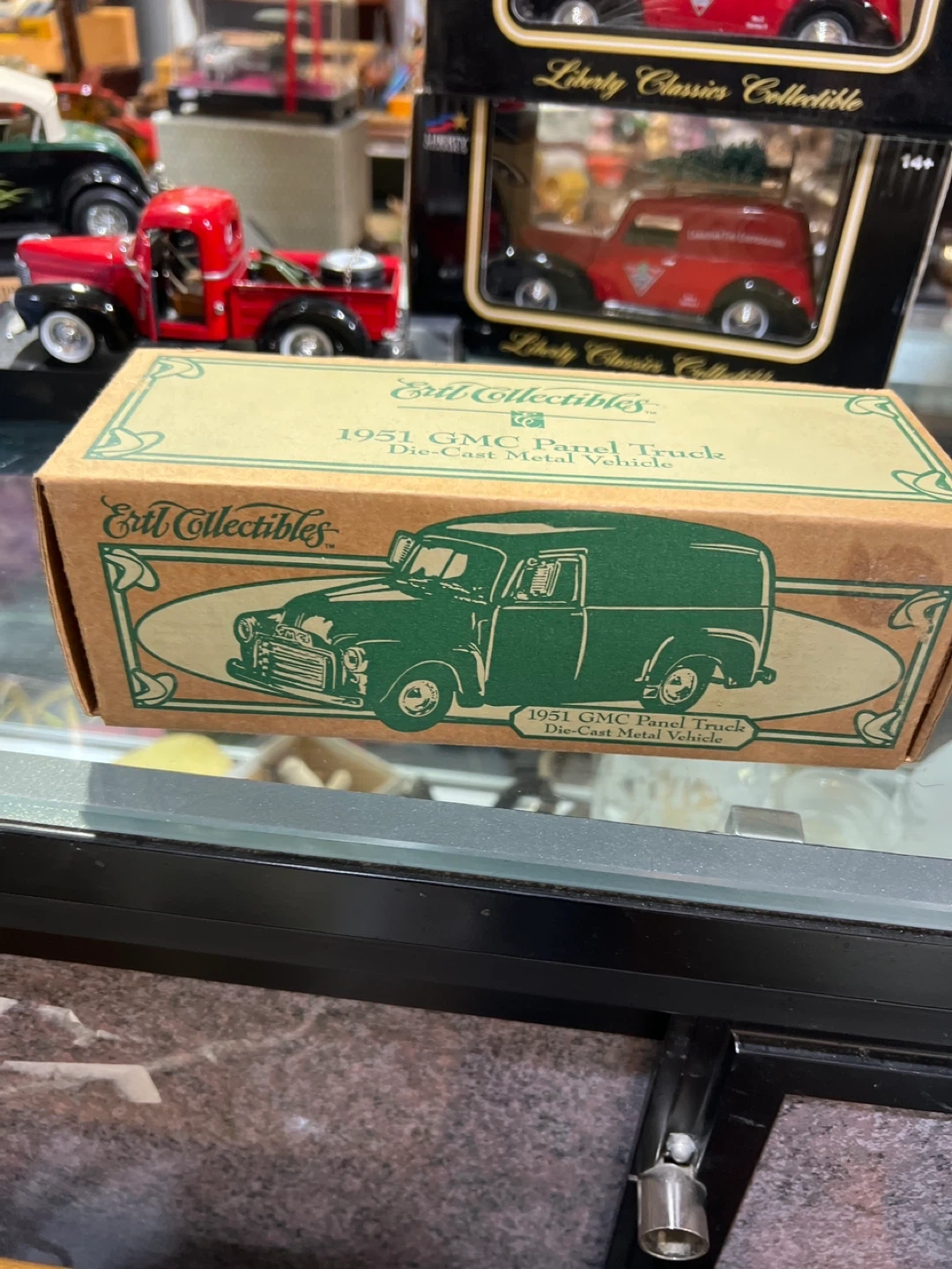 This is an Ertl Collectibles 1951 GMC Panel Truck die-cast metal vehicle. It's a detailed model. This collectible is great for display!