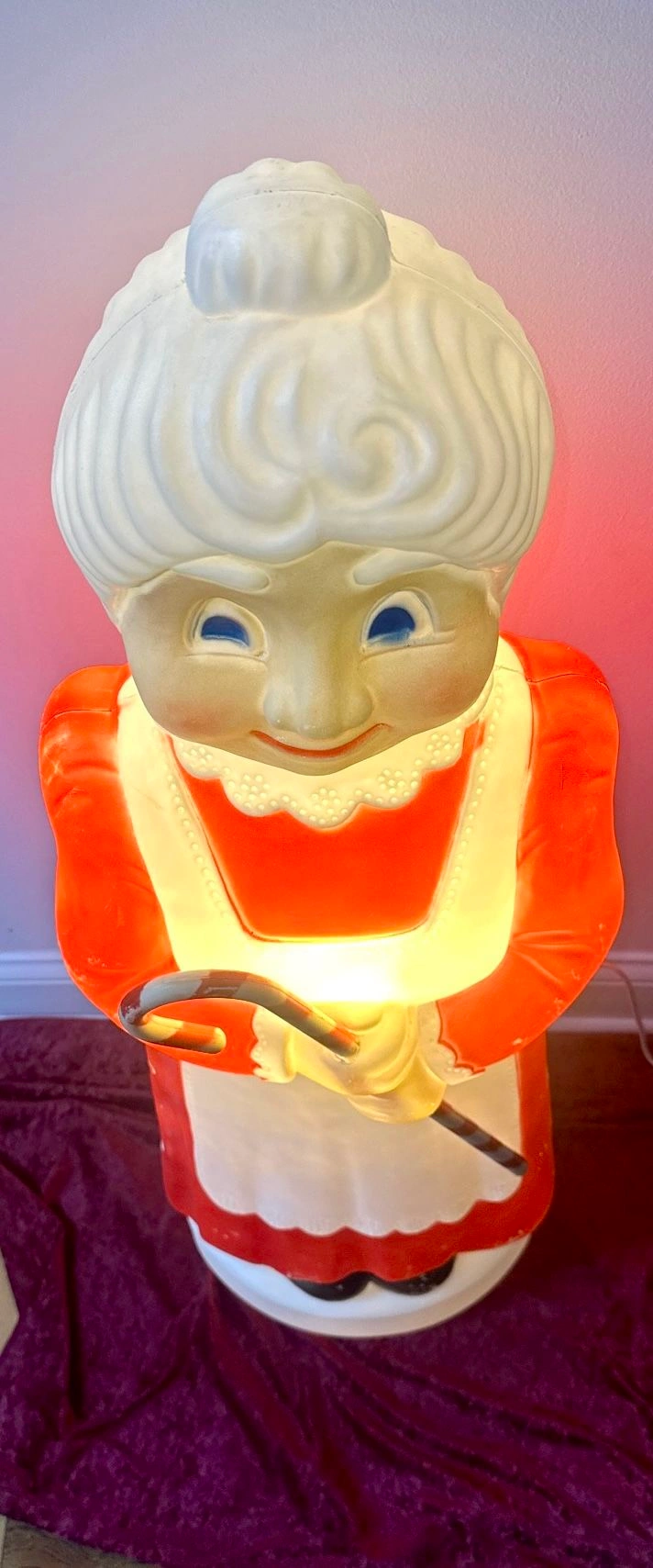 This is a beautiful vintage addition to your Christmas decorations. It's a 40" tall Mrs. Claus blow mold in great condition. It stands 40" tall, has been tested and lights up, and has been well cared for. It's in great condition for its age with no breaks, cracks, or dents, just some minor scuffs, scratches, and paint fades. Please see photos. Cash only sale. Buyer must pick up from the Morton Grove Area. Please check out my other listings.