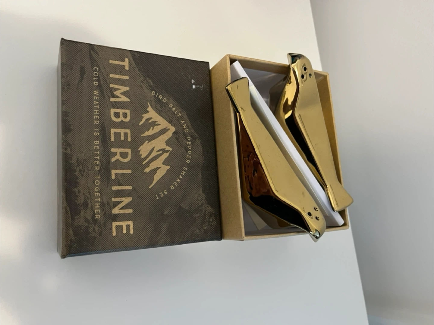 This set includes a gold-coloured bird-shaped salt and pepper shaker set. It comes in its original box. These shakers are ideal for adding a decorative touch to your dining table.