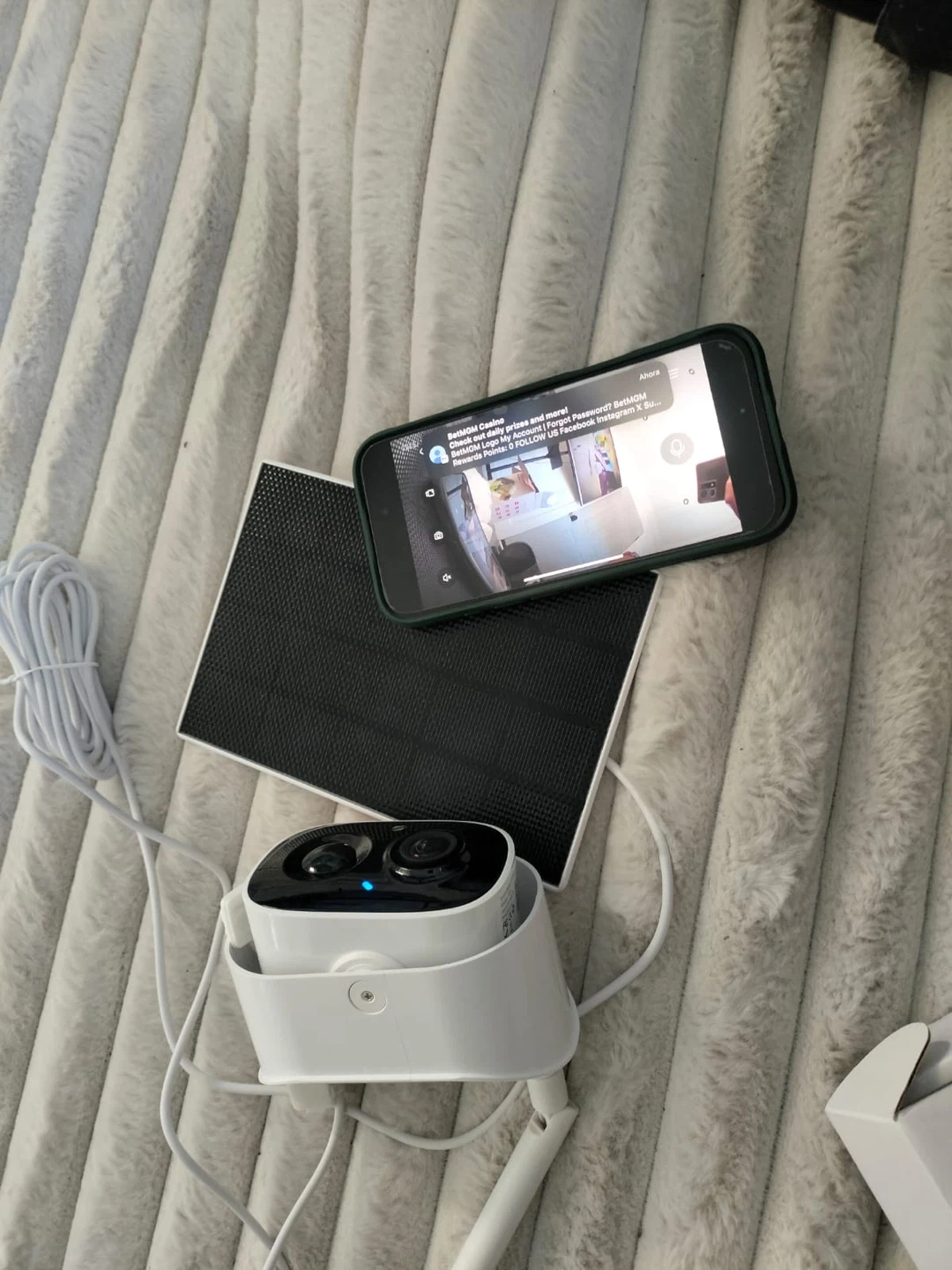 This Arlo Essential Spotlight Camera system includes the camera, a white mounting bracket, and a solar panel with a white charging cable. It's designed for outdoor use. The solar panel helps keep your camera charged!