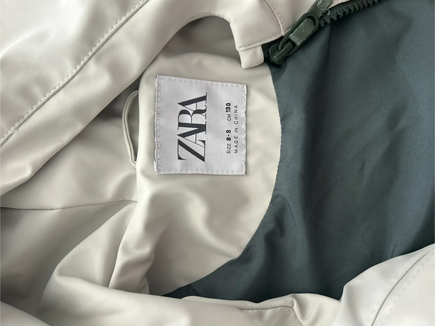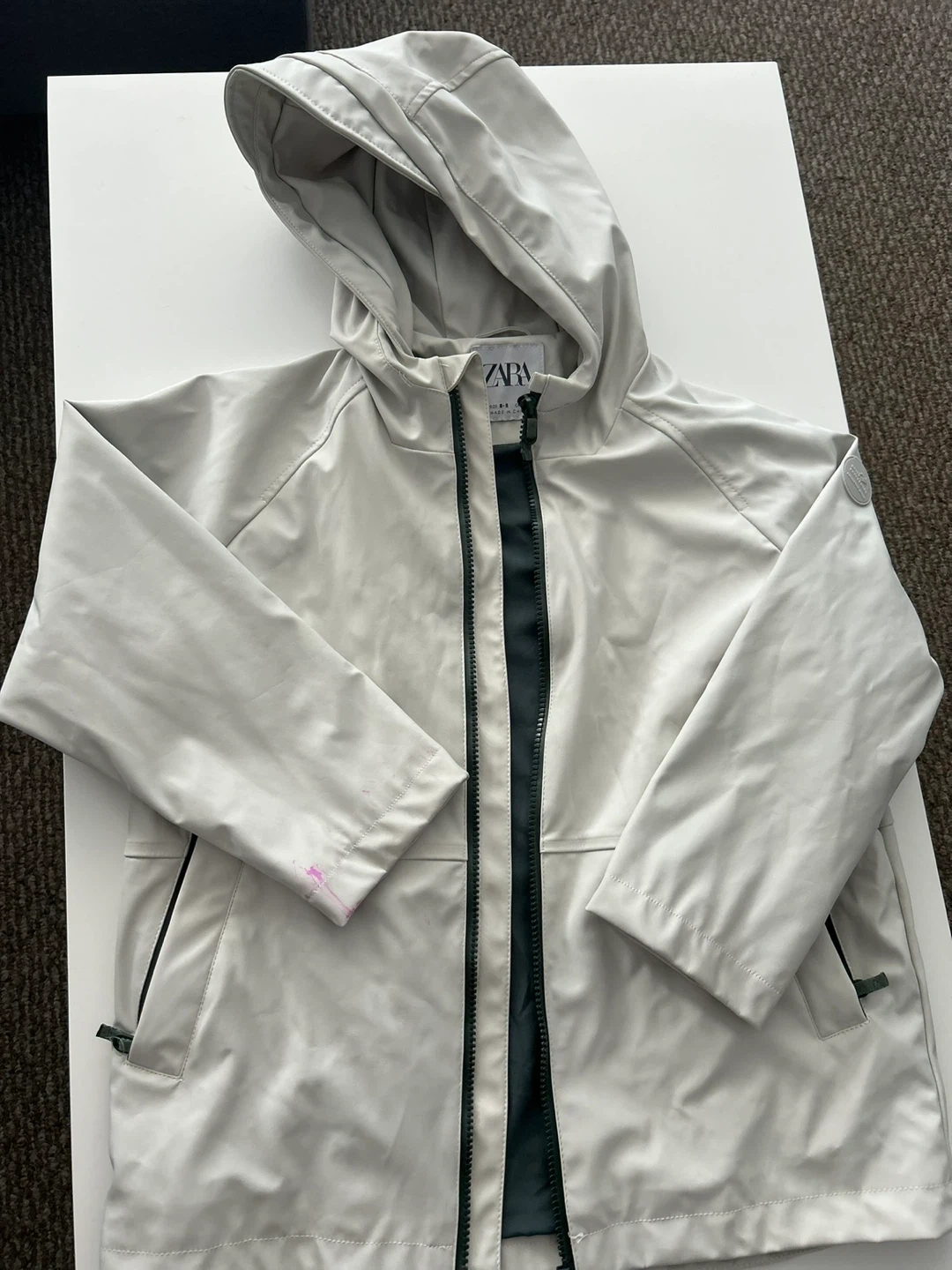 This ZARA rain jacket is designed for kids. It's a light grey colour with a hood and a full zipper closure. The jacket is made of water-resistant material, perfect for keeping dry on damp days.