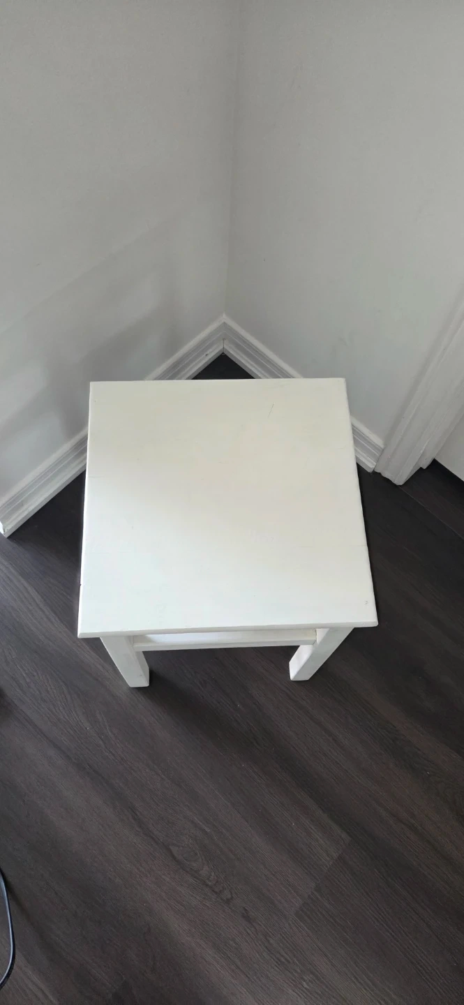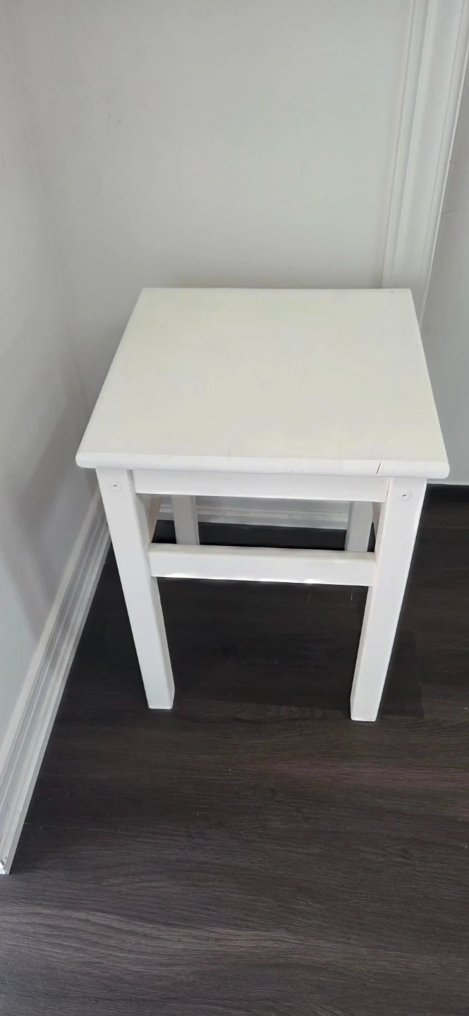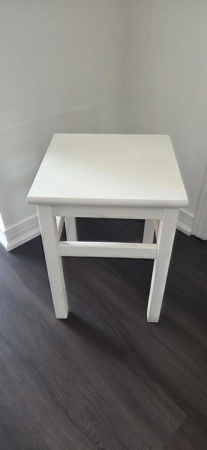 A simple white wooden stool that can also be used as a side table. It's made of solid wood and has a sturdy construction. This stool would be handy for a child's room or bed side table.