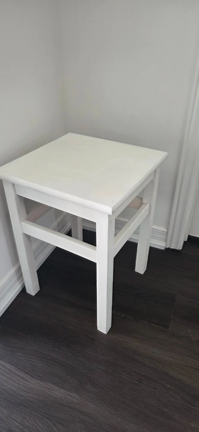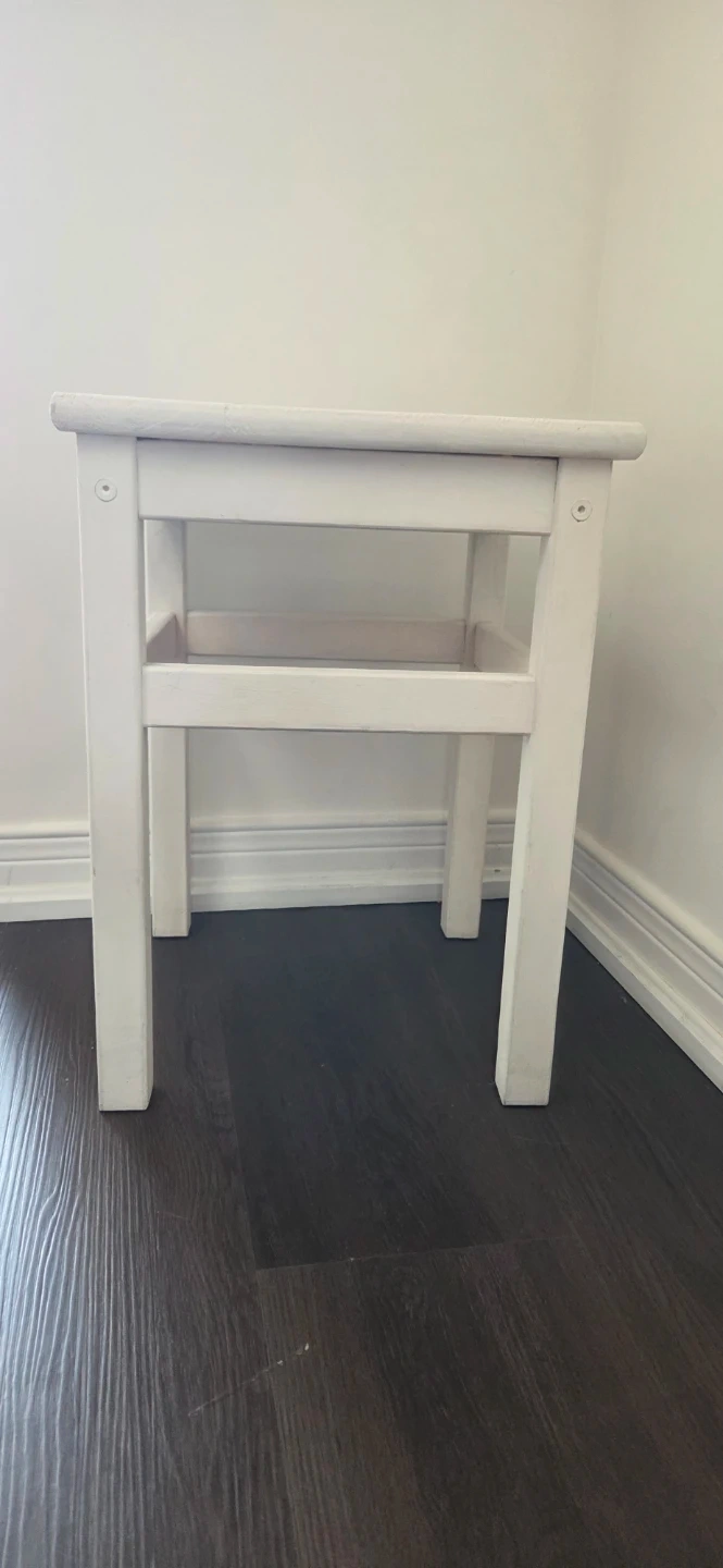 A simple white wooden stool that can also be used as a side table. It's made of solid wood and has a sturdy construction. This stool would be handy for a child's room or bed side table.