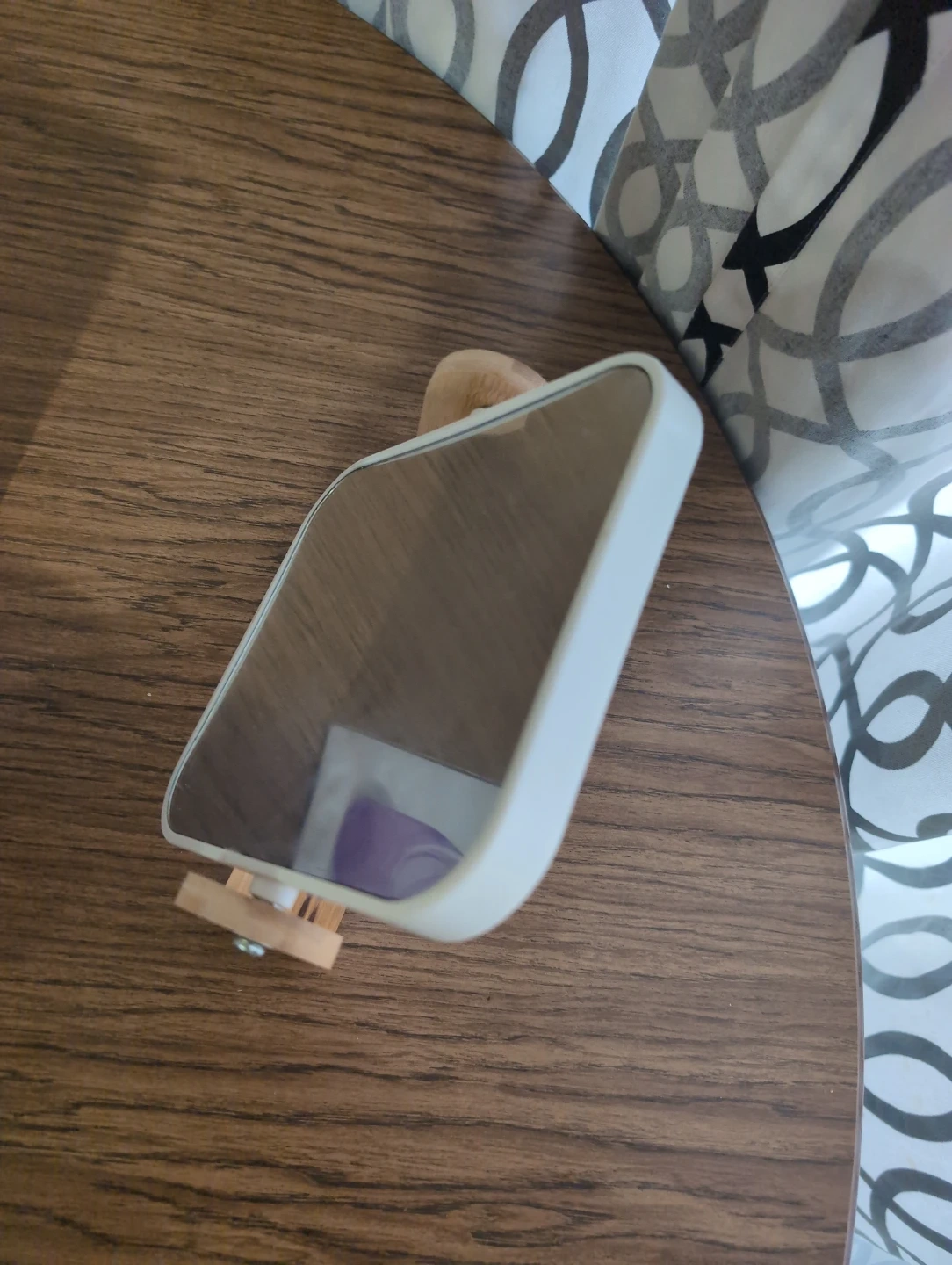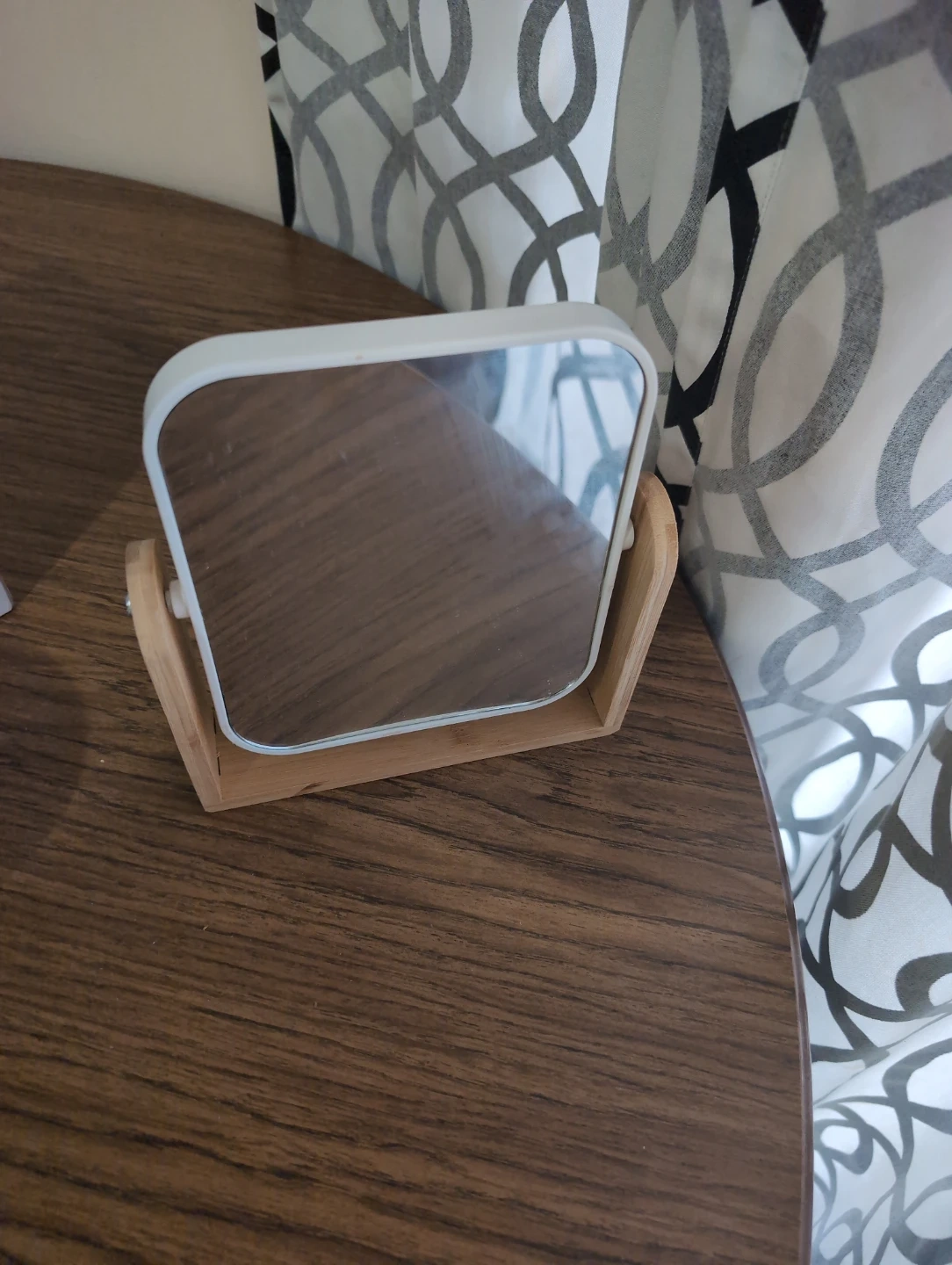 A simple tabletop mirror with a modern white frame and a natural wood stand. It's perfect for applying makeup or a quick grooming check. The mirror is square-shaped and stands on its own.