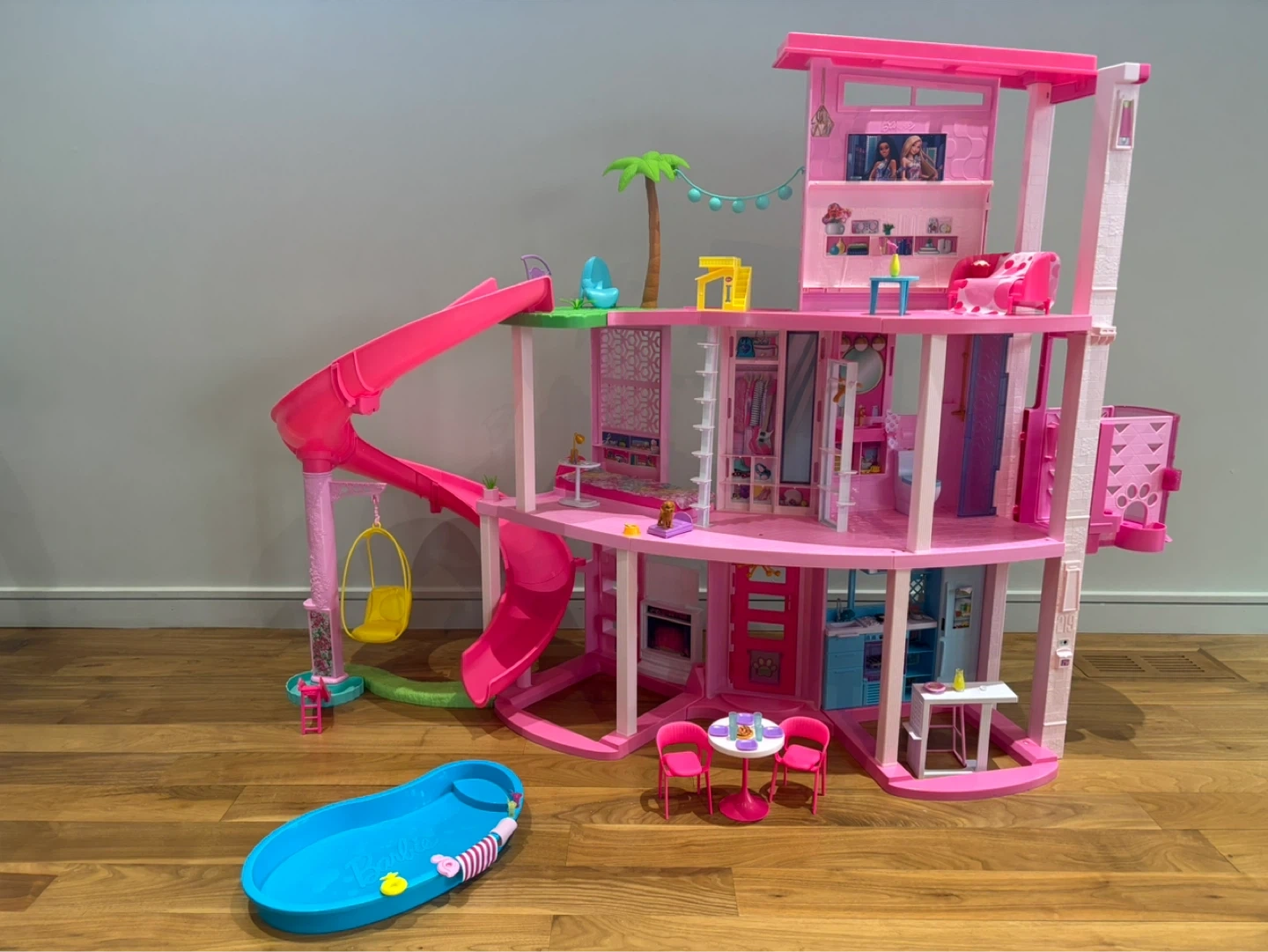 This pink Barbie Dreamhouse is a multi-level playset! It includes a slide, a swing, a pool, and furniture accessories like chairs and a table. Great for imaginative playing.