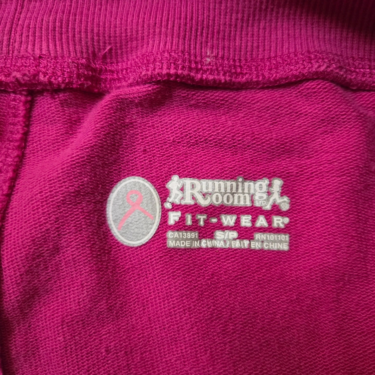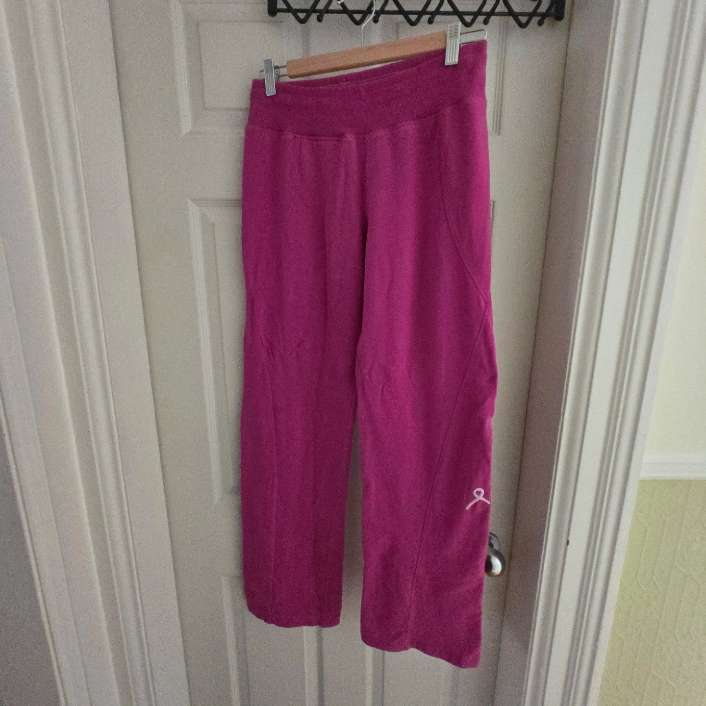 Pink sweatpants from Running Room. Made with 95% cotton and 5% spandex. Features a small pink ribbon graphic on the lower left leg. A comfy choice for casual wear!