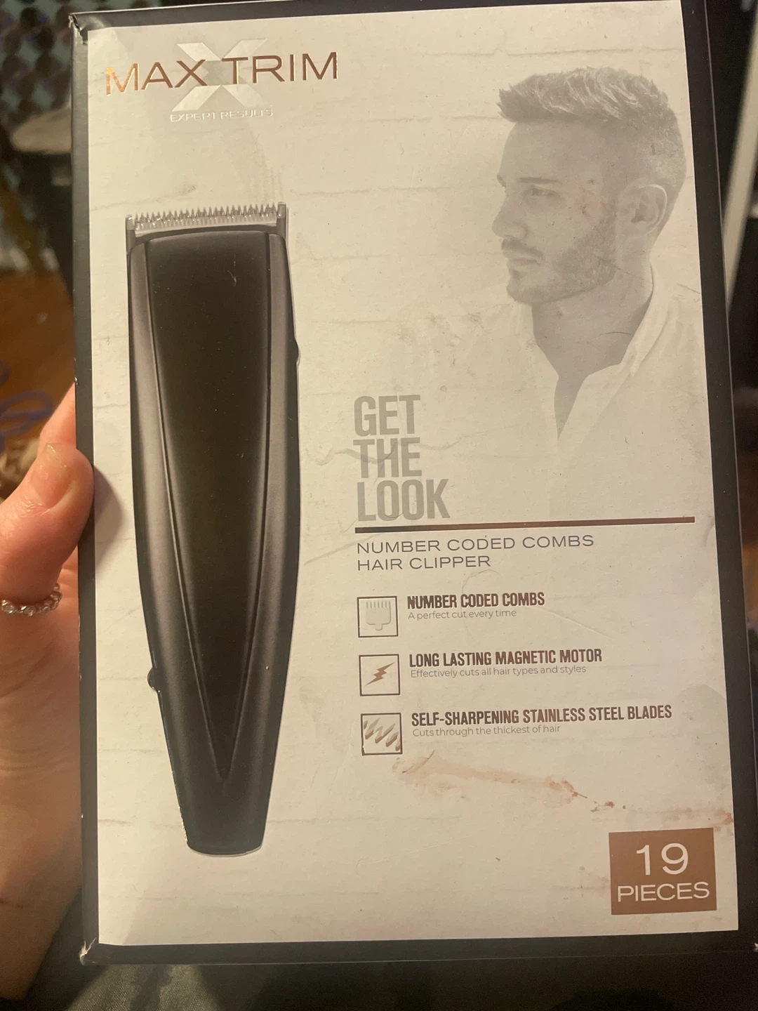 Selling a MAX TRIM hair clipper set. It comes with number-coded combs for a perfect cut every time. The clipper has a long-lasting magnetic motor that effectively cuts all hair types and styles, plus self-sharpening stainless steel blades that cut through even the thickest hair. The set includes 19 pieces!