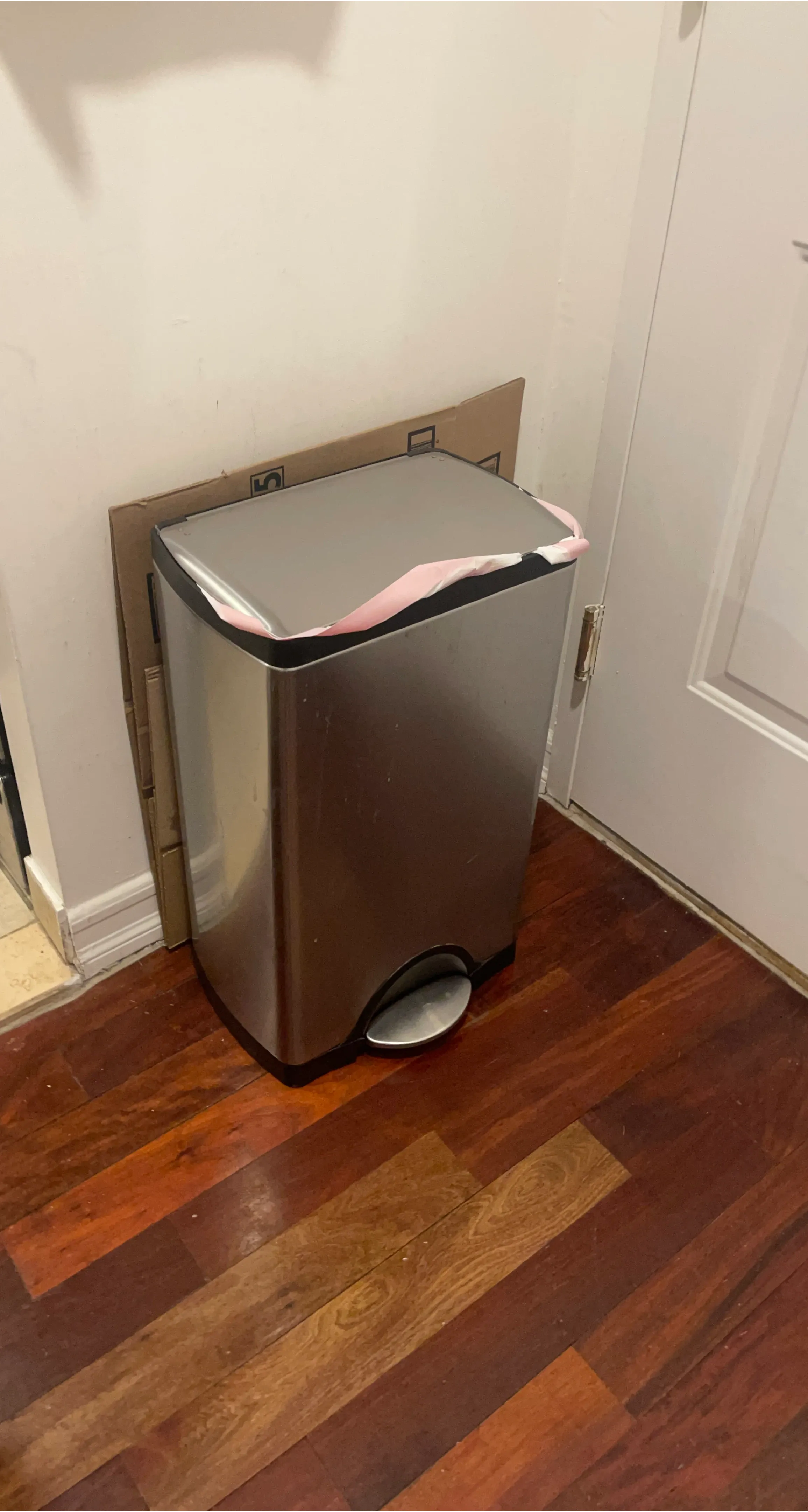 This is a stainless steel step trash can. It's a medium-sized bin with a convenient foot pedal for hands-free operation. Perfect for any kitchen or office space!