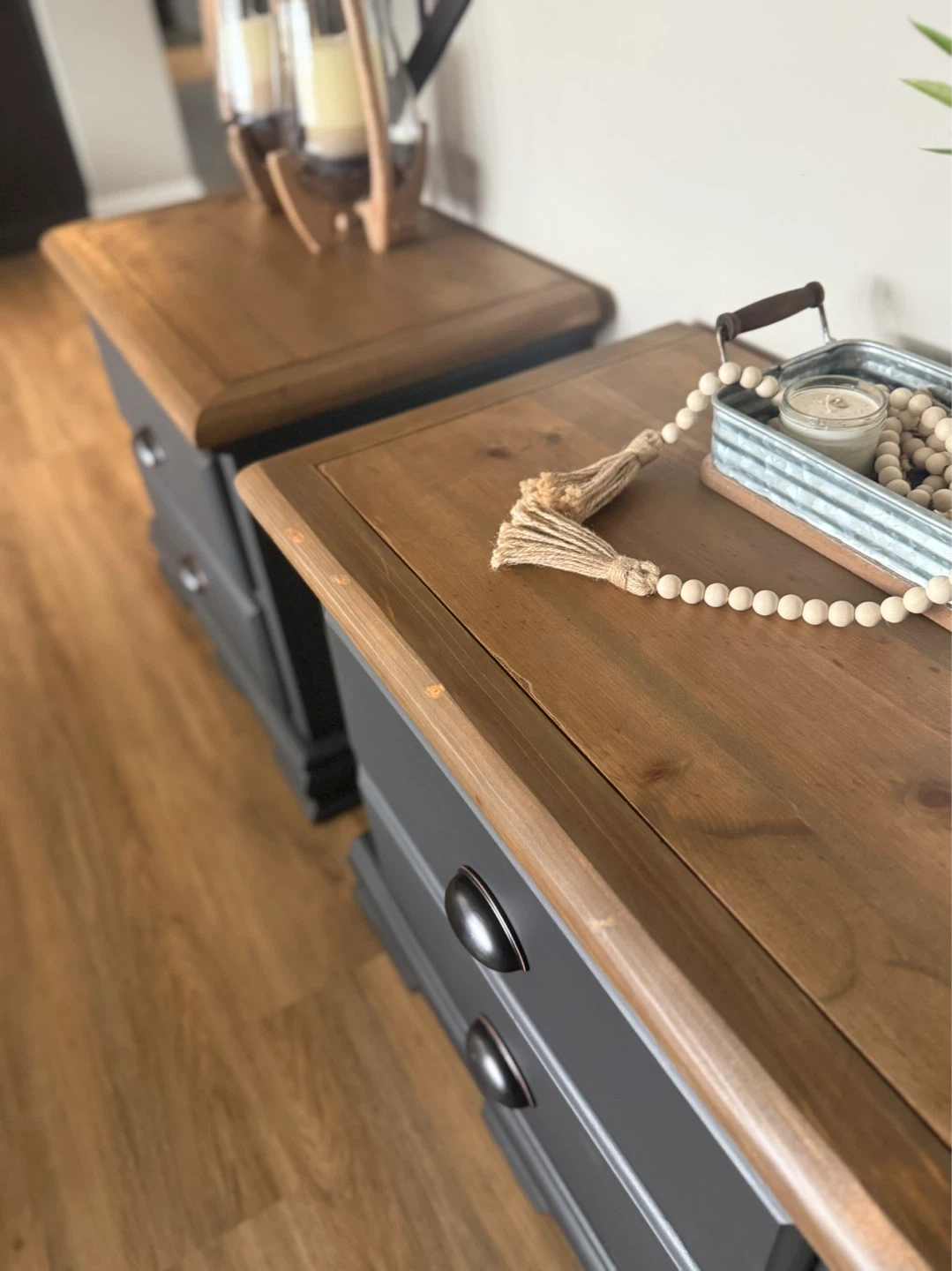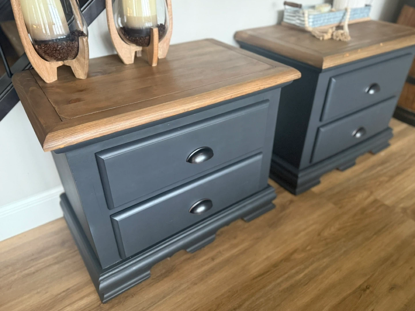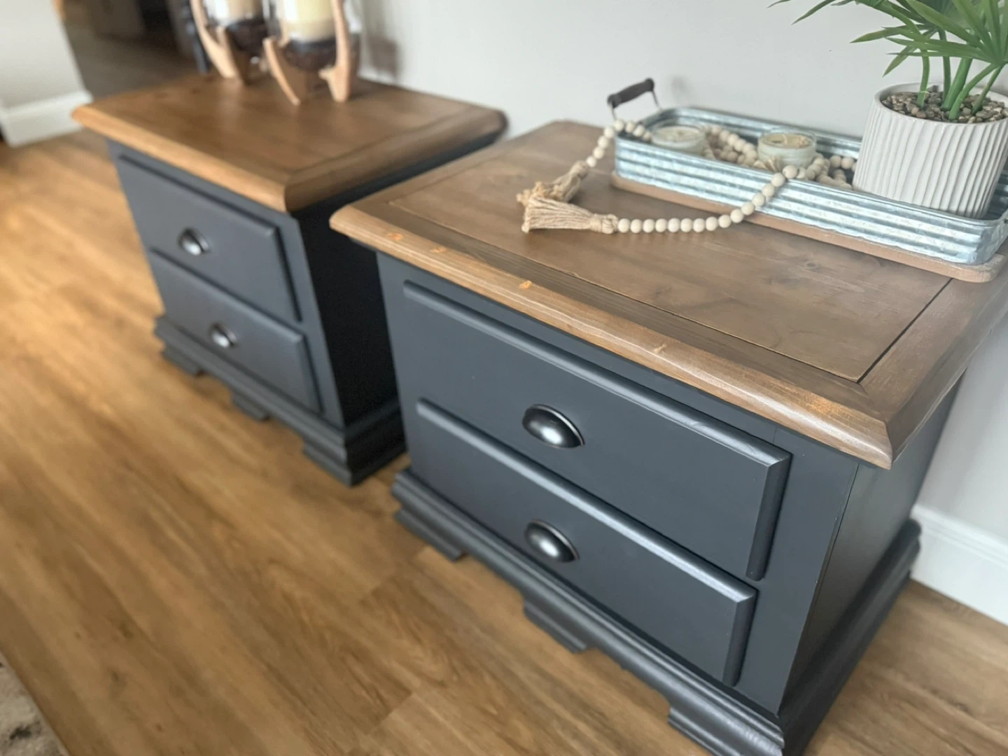 These nightstands have been refinished in the colour Ash (charcoal/blue tones depending on light). The tops have been stained in a warm brown and then lightly distressed. New matte black/copper hardware has been added. Pick up St Albert. $380 for the pair