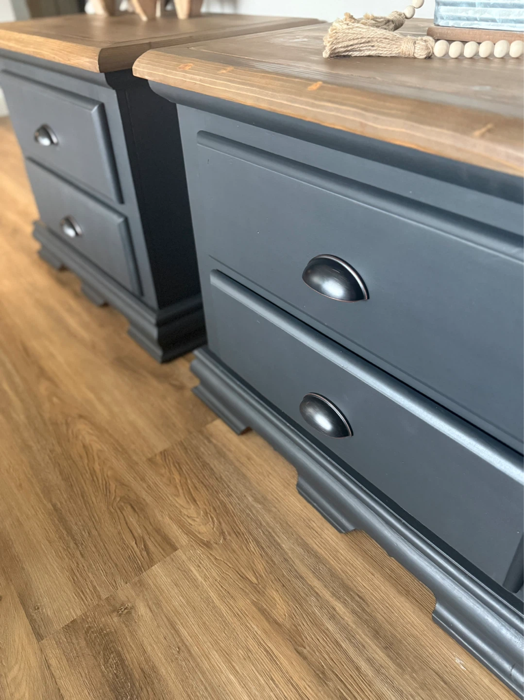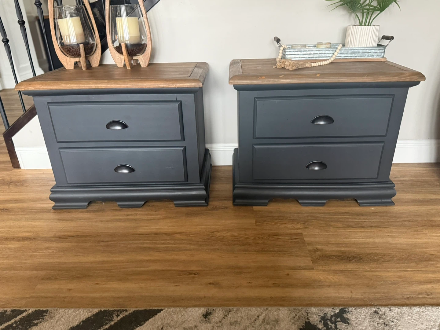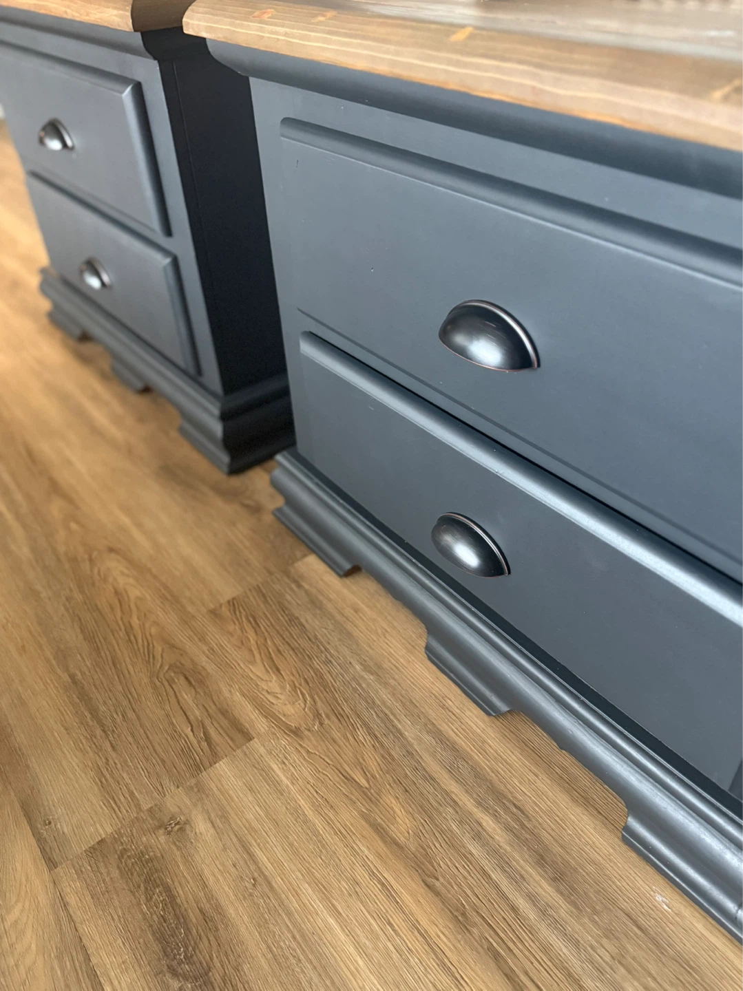 These nightstands have been refinished in the colour Ash (charcoal/blue tones depending on light). The tops have been stained in a warm brown and then lightly distressed. New matte black/copper hardware has been added. Pick up St Albert. $380 for the pair