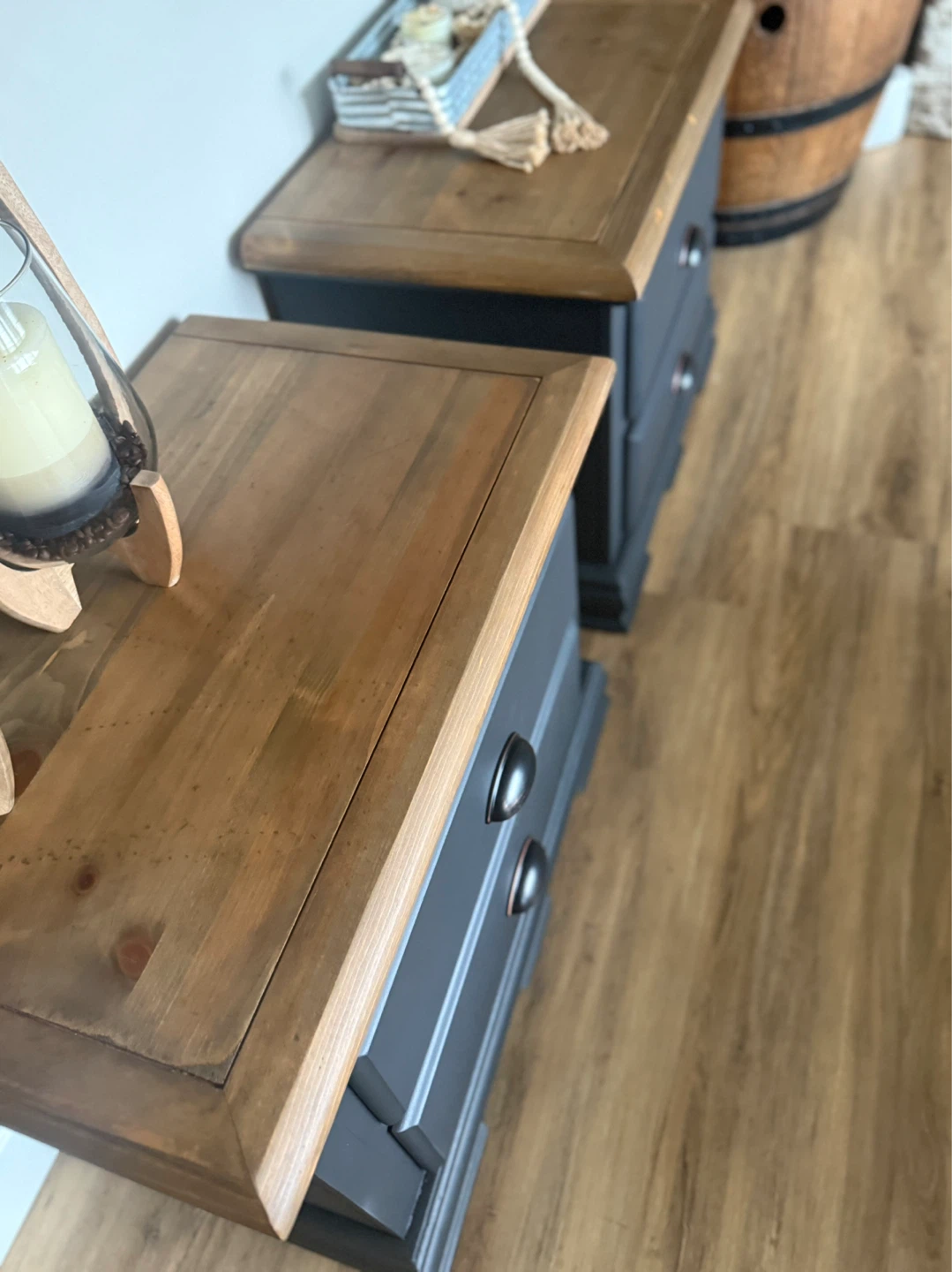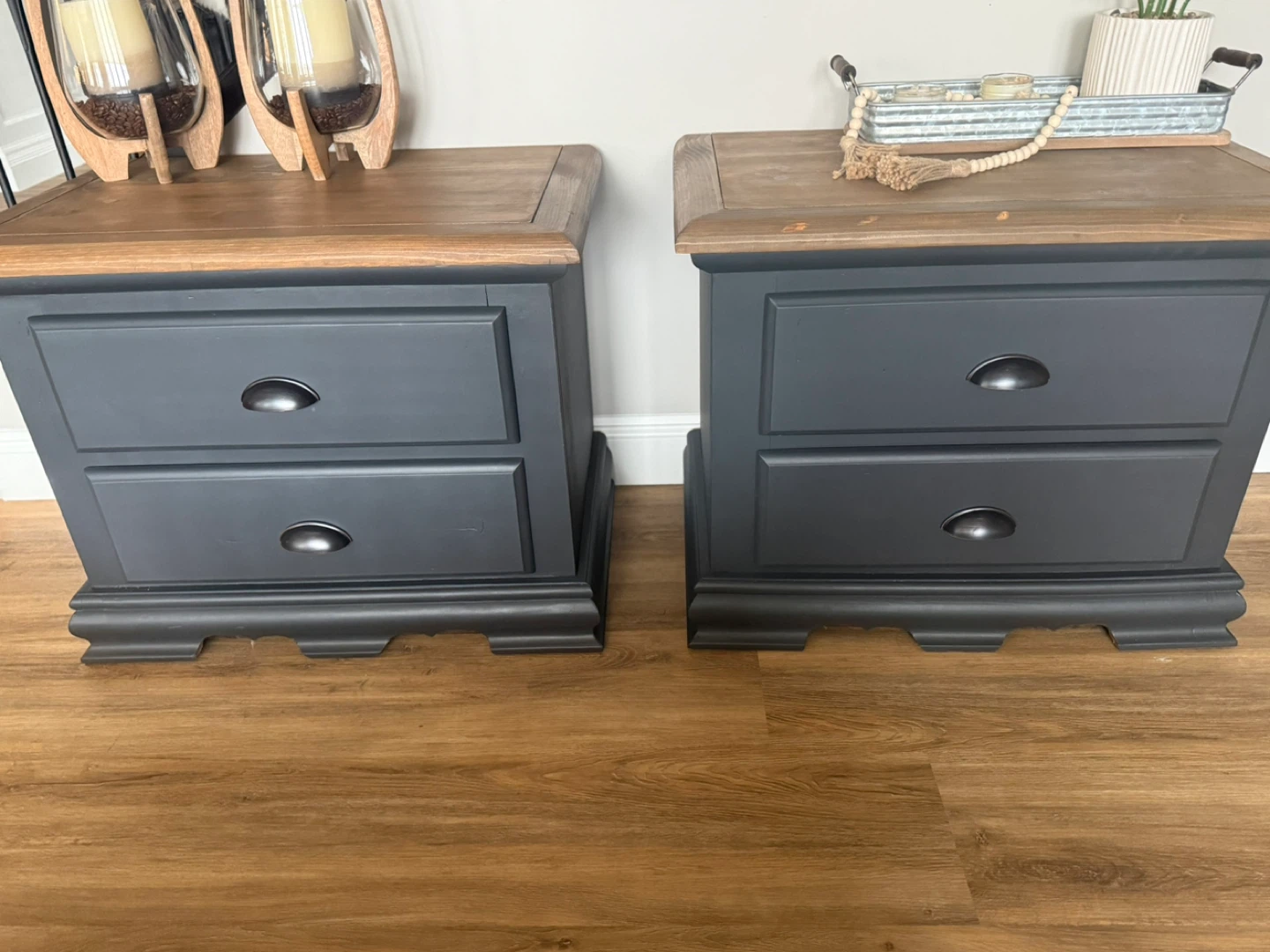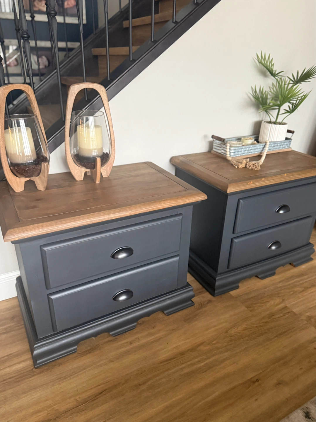 These nightstands have been refinished in the colour Ash (charcoal/blue tones depending on light). The tops have been stained in a warm brown and then lightly distressed. New matte black/copper hardware has been added. Pick up St Albert. $380 for the pair
