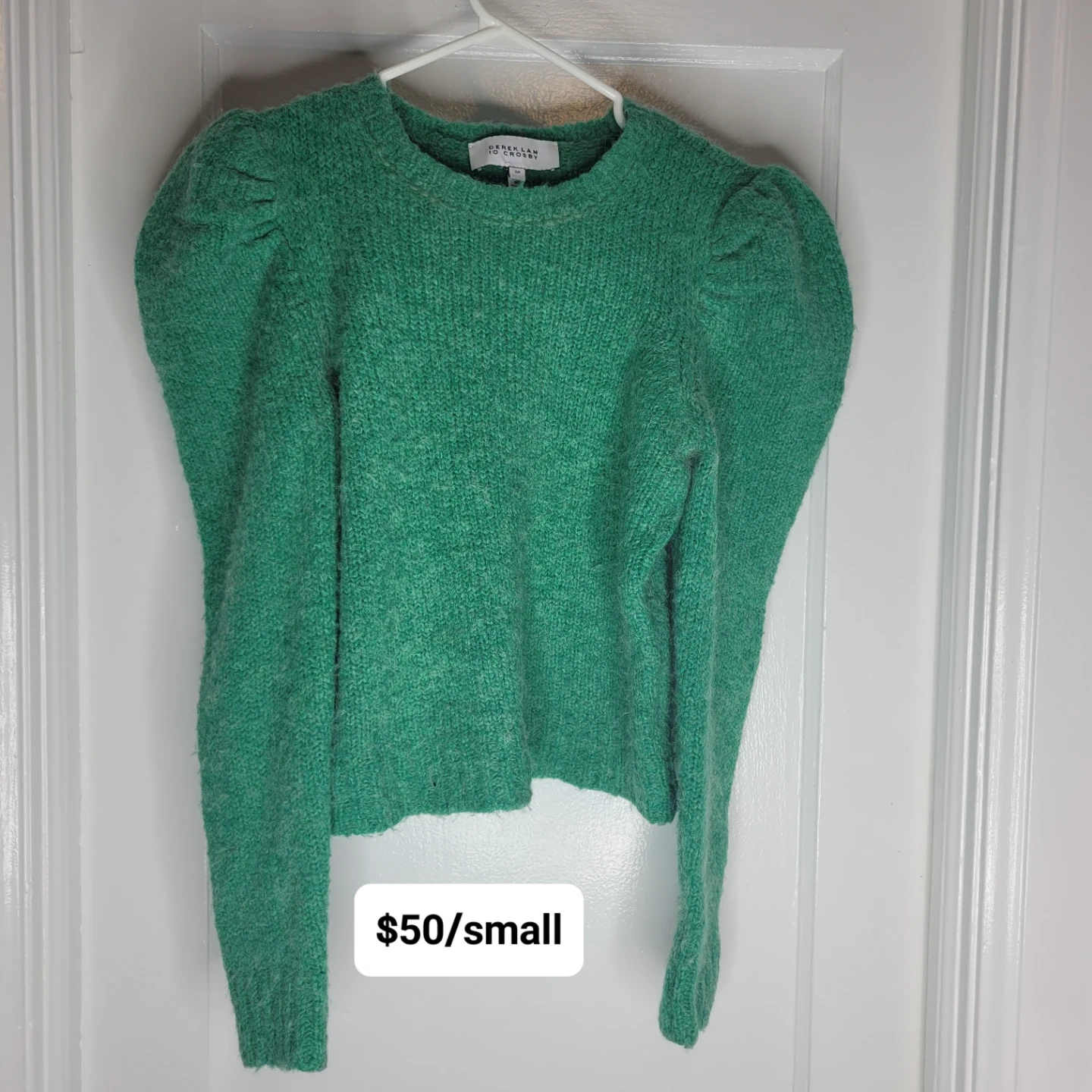 Cozy green knit sweater from Derek Lam 10 Crosby. It's a size S/P with distinctive puff sleeves. Lovely soft texture! Well loved