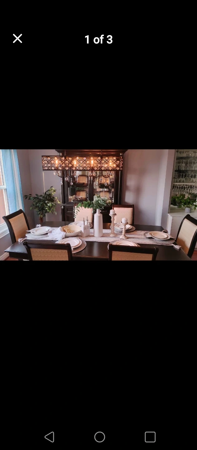 Stylish dark wood dining table with upholstered chairs. The set includes the table and six chairs with patterned beige fabric and center leaf. It's perfect for family dinners or entertaining guests. 41" x 64" .Add 14" with leaf.