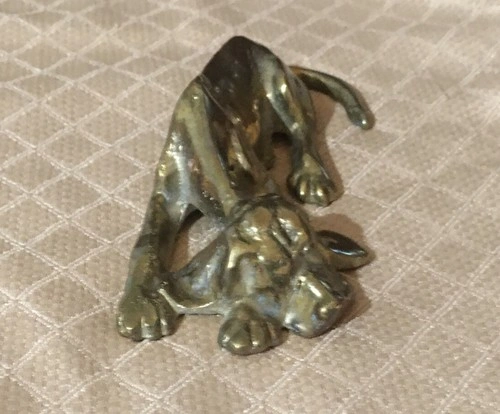 Vintage Brass Hound Dog Figurine Paper Weight is adorable and an excellent addition to your desk or bookshelf. He is lovely. Approximately 5 inches (13cm) long and 2.5 inches (6cm) wide and 2 inches (4-5cm) tall.