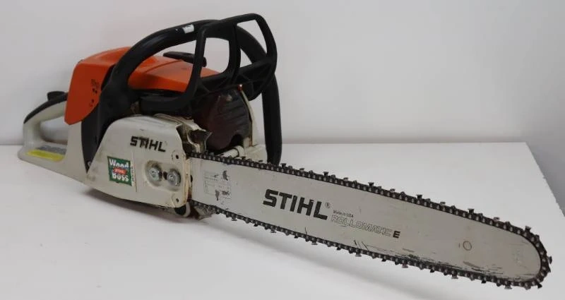 This is a Stihl Wood Boss chainsaw. It features a Rollomatic E guide bar. Suitable for clearing brush and felling small trees.