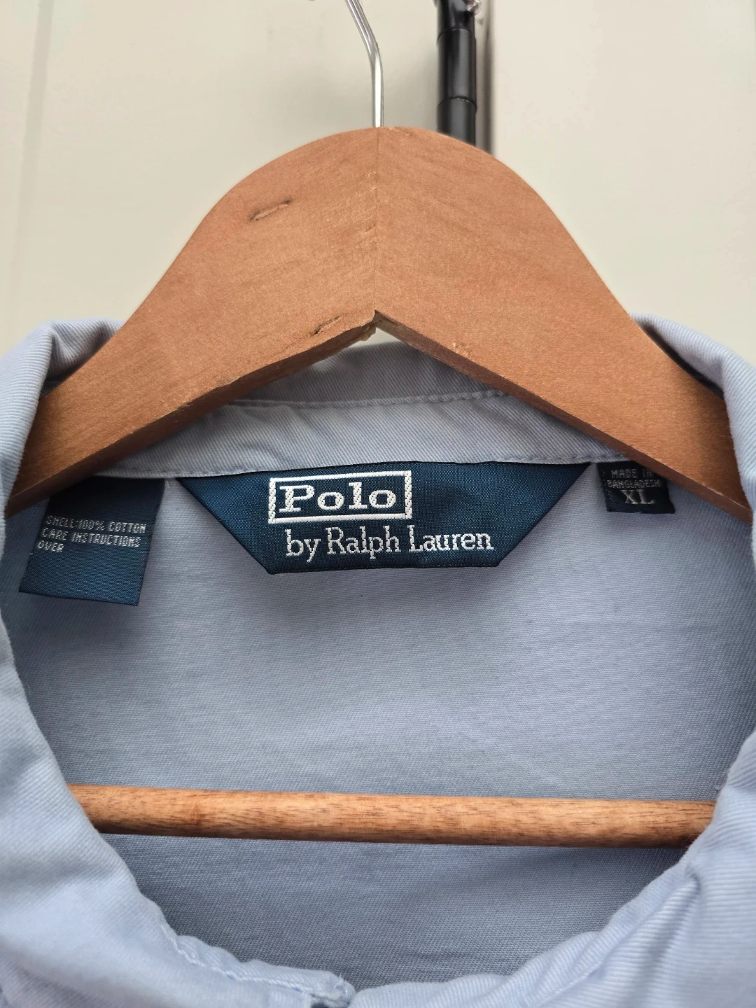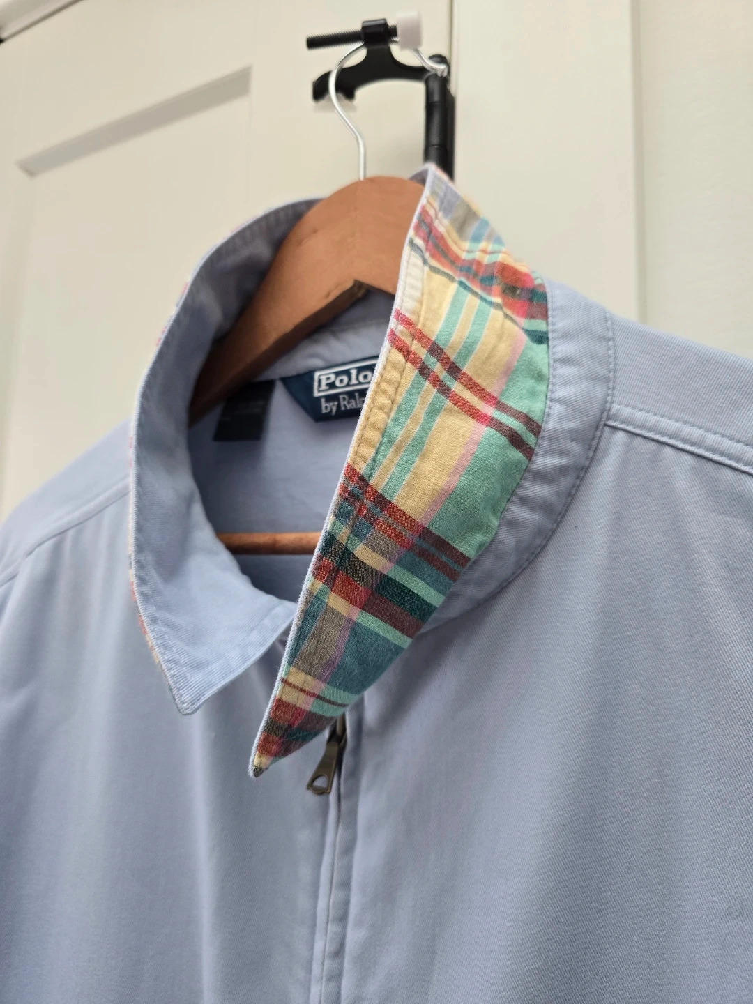This light blue jacket from Polo by Ralph Lauren features a classic Harrington style with a full zip closure. It's made of 100% cotton for comfort. The interior collar has a plaid lining detail. This jacket is a size XL.
