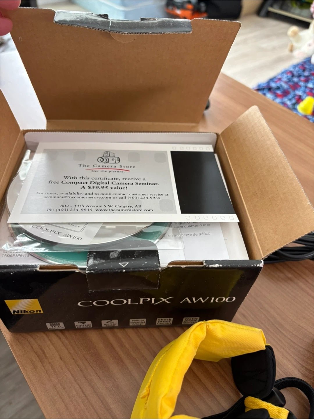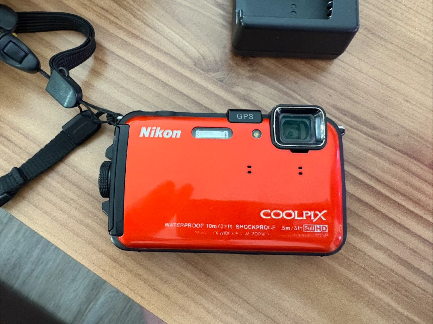 This is a Nikon COOLPIX AW100 digital camera in orange. It's waterproof to 10m/33ft and shockproof to 1.5m/5ft. It comes with the original box, charger, and a yellow floating wrist strap. It also includes GPS functionality.
