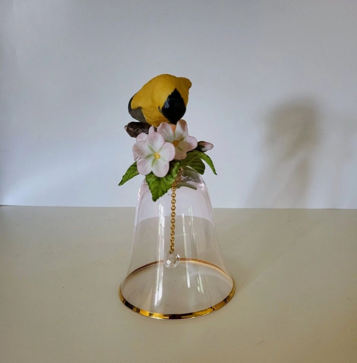 Lovely figurine, goldfinch perched on a bell. Features delicate flowers. Glass bell with gold trim. Collectible piece. Franklin mint.