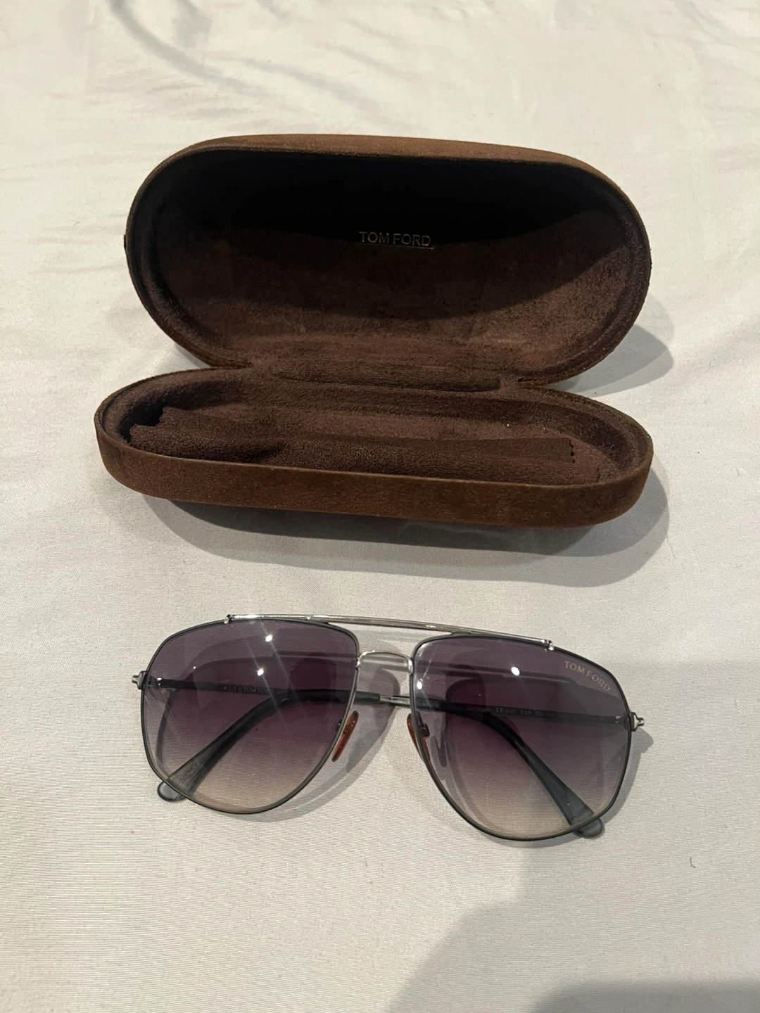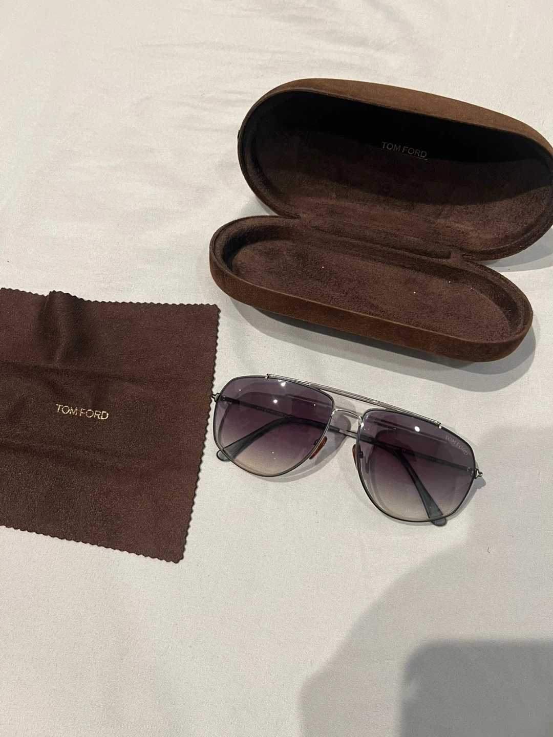 These Tom Ford sunglasses feature a metal frame with gradient lenses. They come with a protective case and cleaning cloth. Perfect for sunny days!