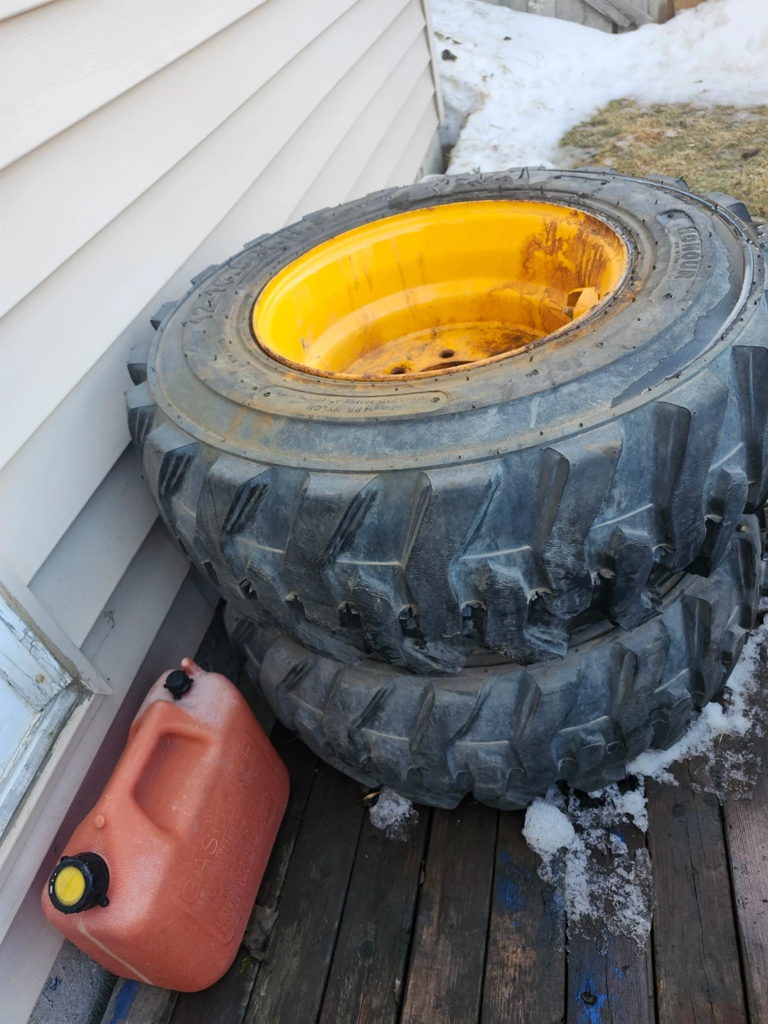 Selling used tractor tires, size 12-16.5. They have a yellow rim and show some signs of wear, as seen in the pictures