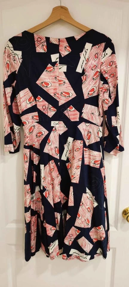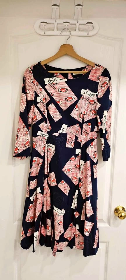 Unique dress with a cool navy, pink, and white pattern. Features 3/4 sleeves and a comfy rounded neckline. Super cute for everyday or dressing up a bit. Material: cotton.