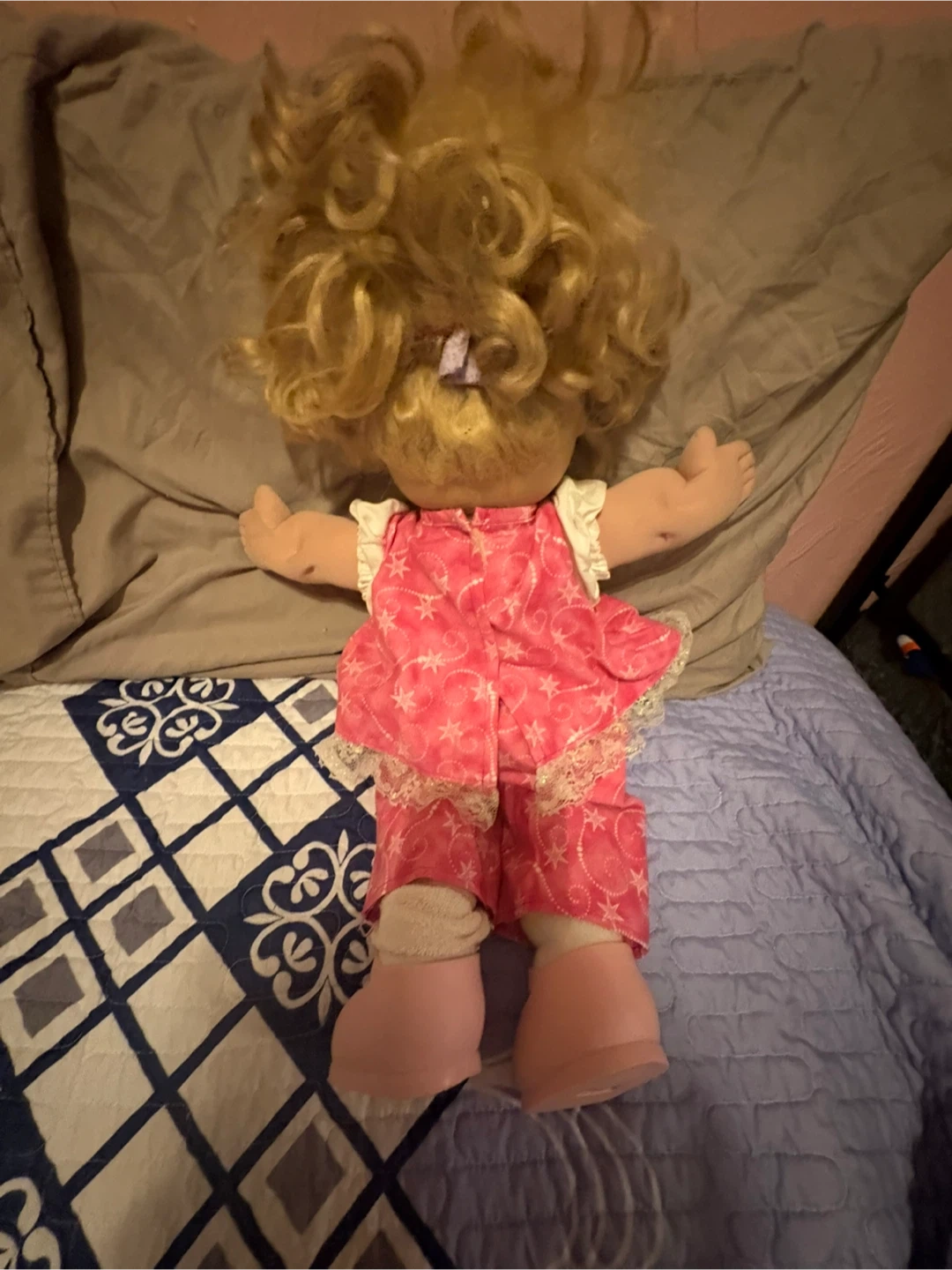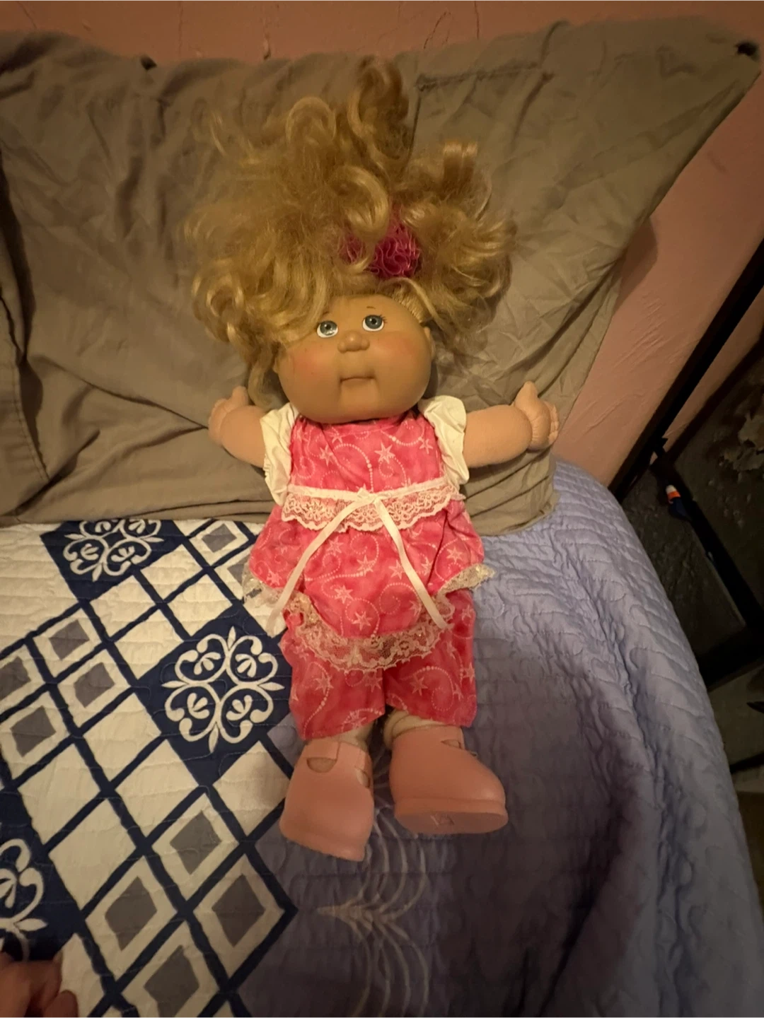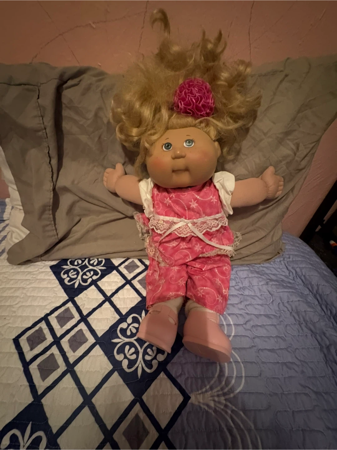 Selling a Cabbage Patch Kids doll! It's wearing a pink outfit with white lace and has blonde hair with a pink flower accessory. Great for collectors or as a gift for a child