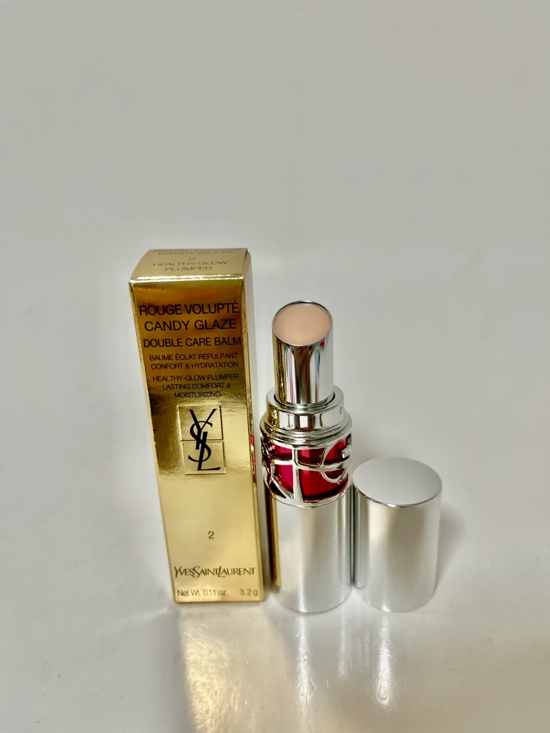 Yves Saint Laurent Candy Glaze Lip Gloss Stick in Shade 2. Offers a healthy glow plumper finish with lasting comfort and moisturizing properties. It's a 3.2g lip product.