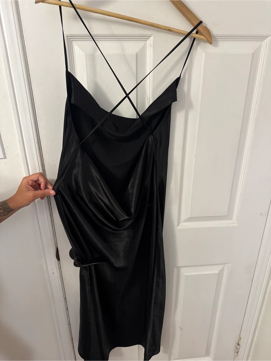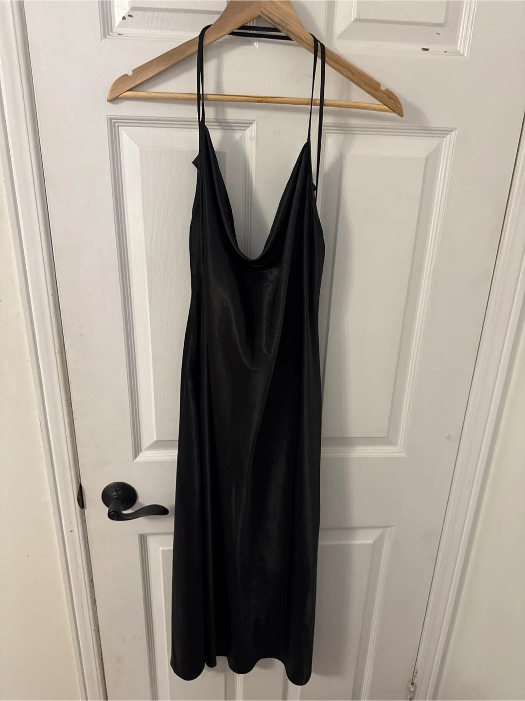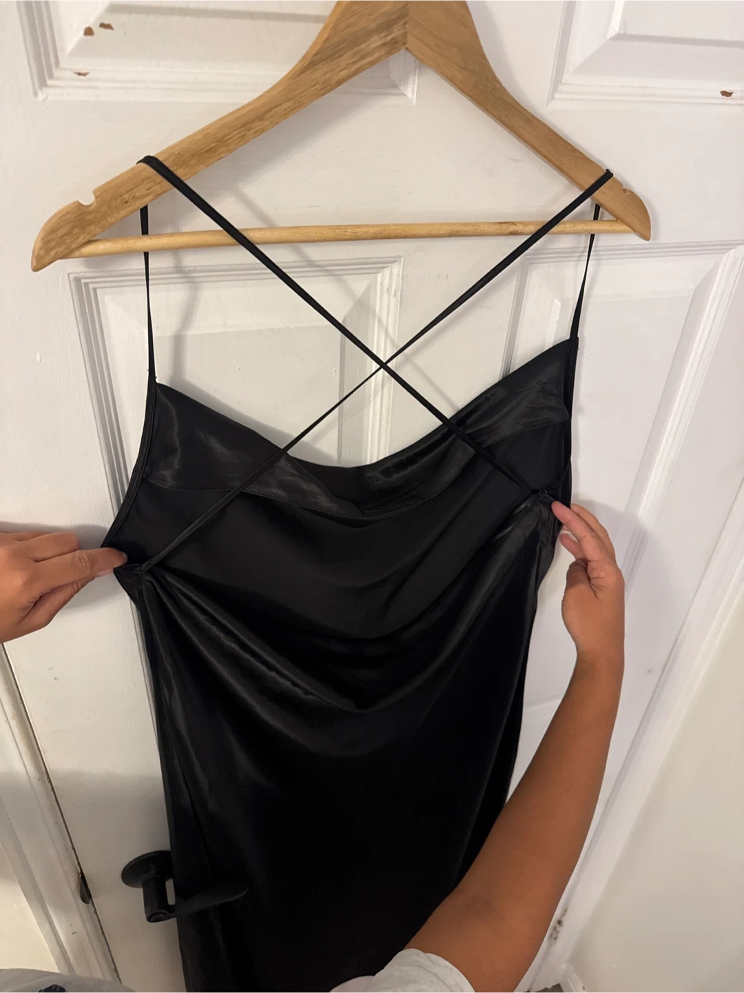 This H&M Divided slip dress is black and made from a satin material. It features a cowl neck and a criss-cross back detail. Size L.