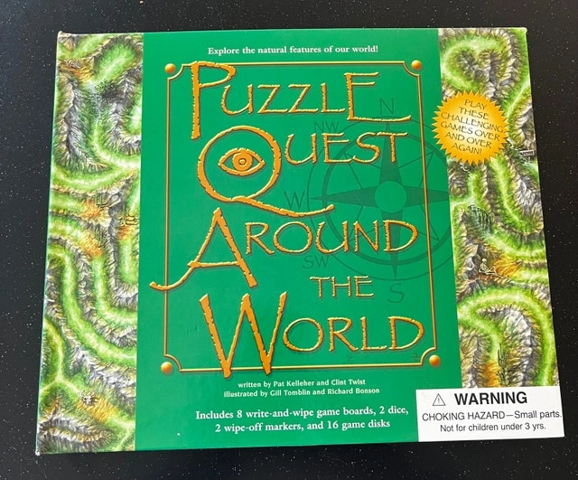 Explore the natural features of our world with the Puzzle Quest Around The World game, designed for ages 6-11. This educational game includes 8 write-and-wipe game boards, 2 dice, 2 wipe-off markers, and 16 game disks for endless fun and learning. All components are included. Fact boxes, map-reading tips, and explanations of natural geographic features are included too. The original price was $29.95. Suitable for ages 6-11. If the ad is still up, it's still available!