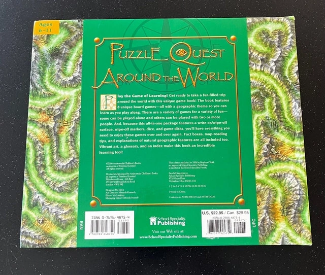 Explore the natural features of our world with the Puzzle Quest Around The World game, designed for ages 6-11. This educational game includes 8 write-and-wipe game boards, 2 dice, 2 wipe-off markers, and 16 game disks for endless fun and learning. All components are included. Fact boxes, map-reading tips, and explanations of natural geographic features are included too. The original price was $29.95. Suitable for ages 6-11. If the ad is still up, it's still available!