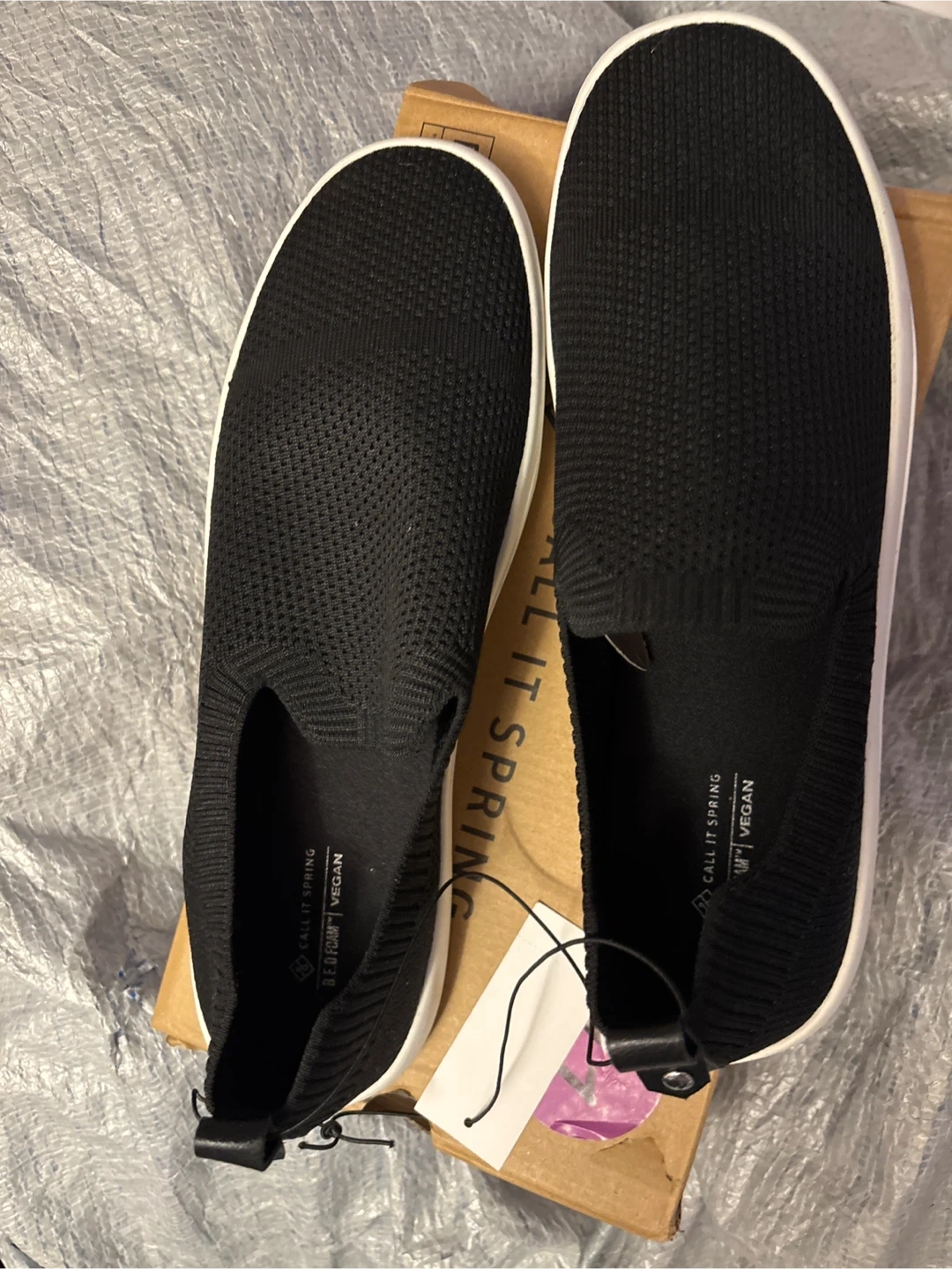 Black knit slip-on sneakers from Call It Spring. Size 11. These shoes are vegan. They feature a comfortable knit upper and a durable sole.