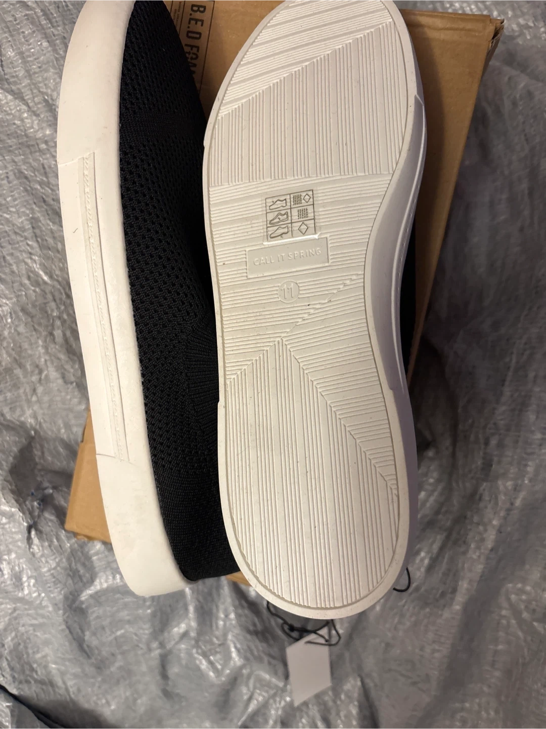 Black knit slip-on sneakers from Call It Spring. Size 11. These shoes are vegan. They feature a comfortable knit upper and a durable sole.