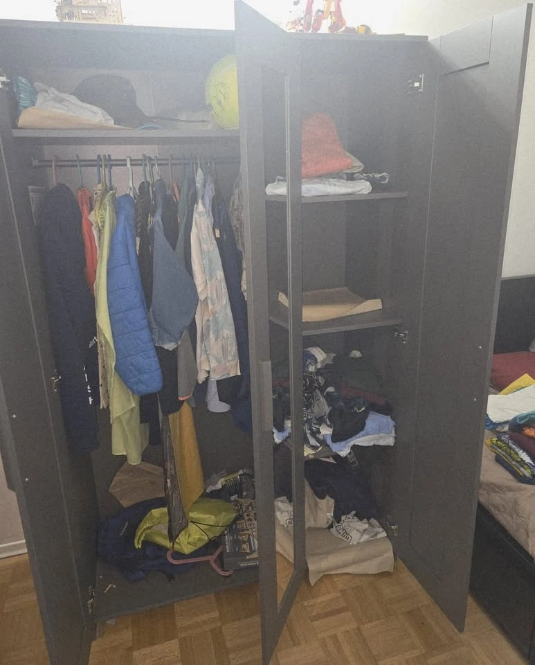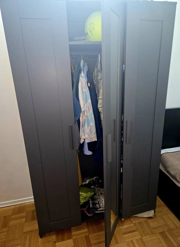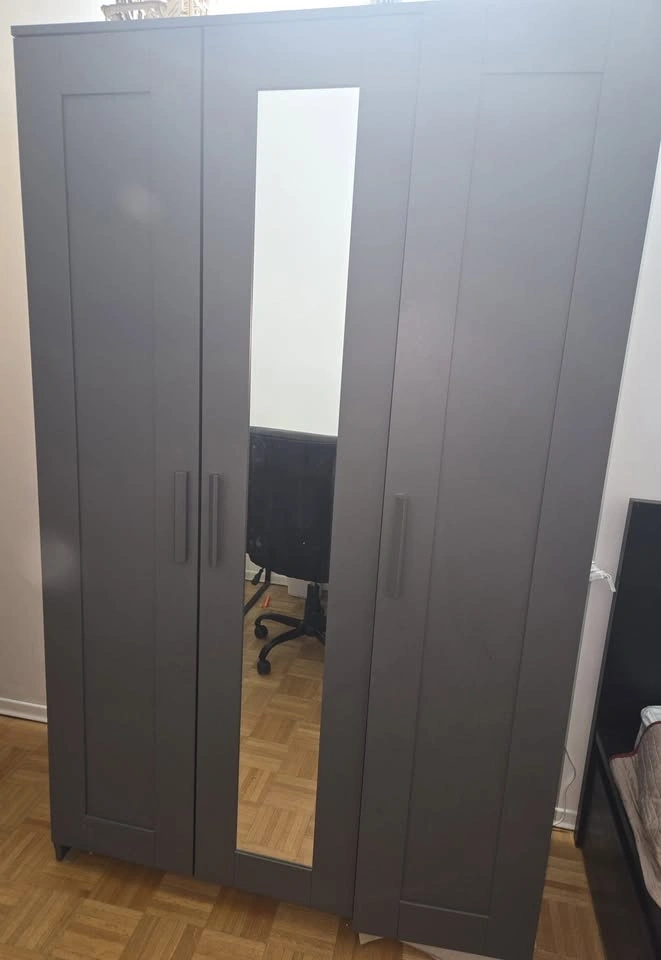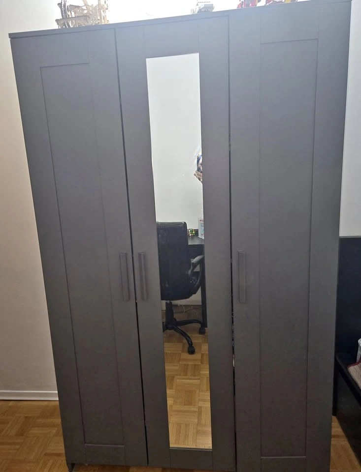 Grey wardrobe. Size: 117x50x190 cm (46x19 3/4x74 3/4 "). Features a clothes rail for shirts and dresses, shelves for folded clothes, shoes and bags, and a mirror door.