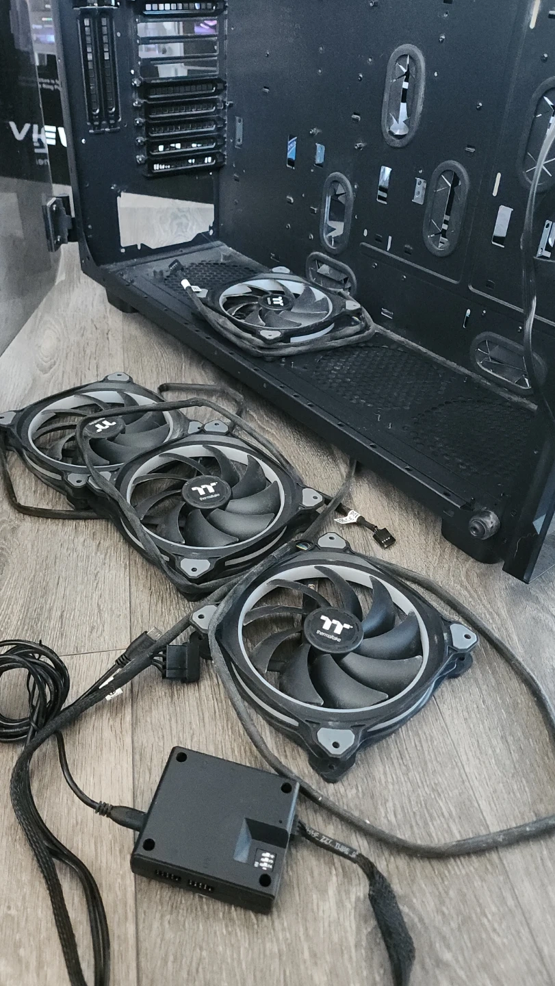 Comes with 4 x thermaltake 140mm RGB fans, massive harddrive cage and vertical gpu mount that's removable, front header cables and all the screws and accessories along with original packaging and padding