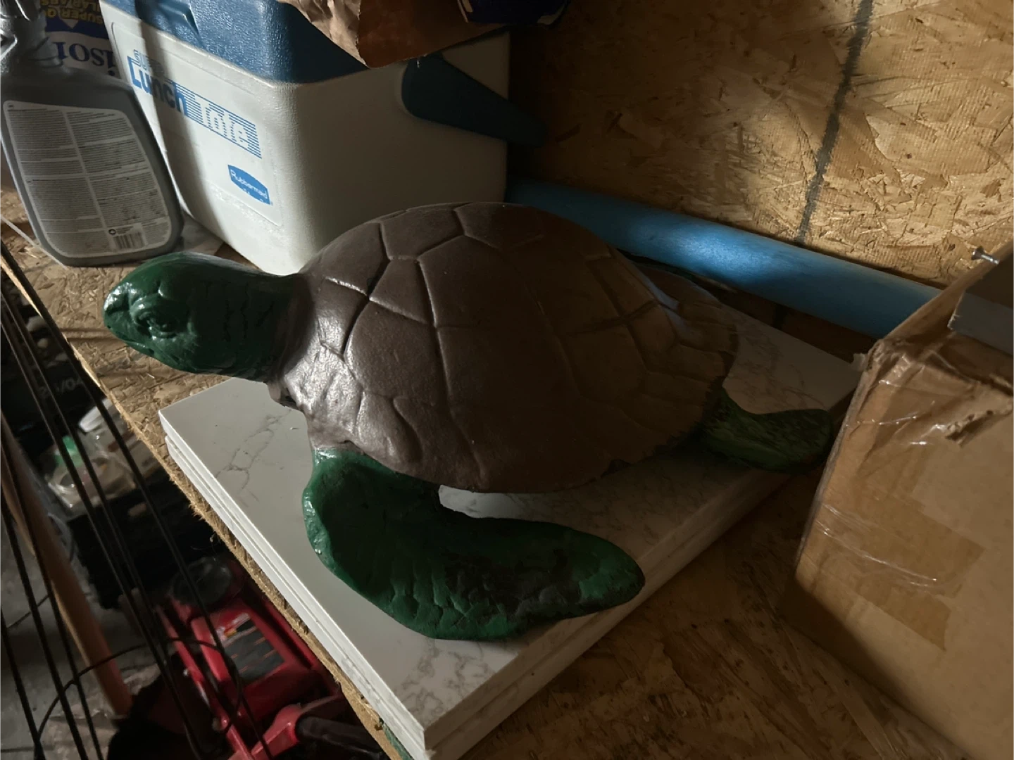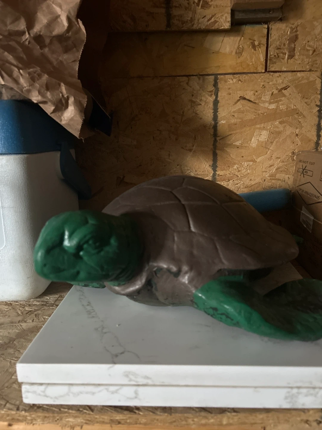 Selling a turtle garden ornament. It has a brown shell and green feet. It has some signs of wear and tear. Painted cast iron turtle 🐢 cast iron. Cash and Carr Keswick