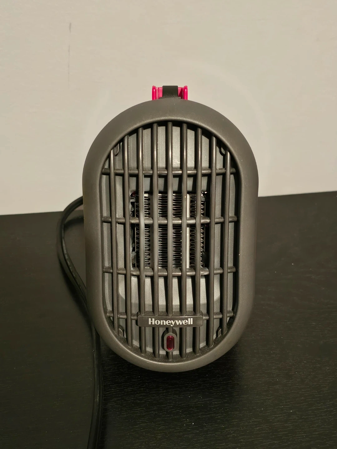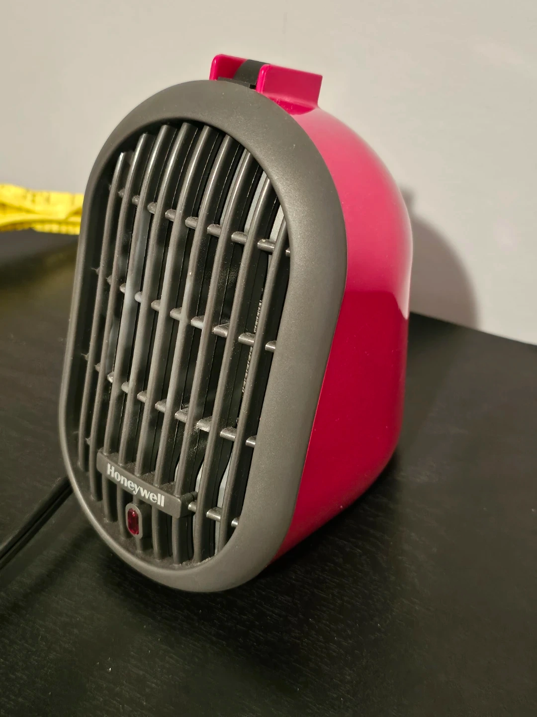 This is a Honeywell personal heater. It's a compact, pink and grey unit designed for personal spaces. Safety warnings are printed on the side.