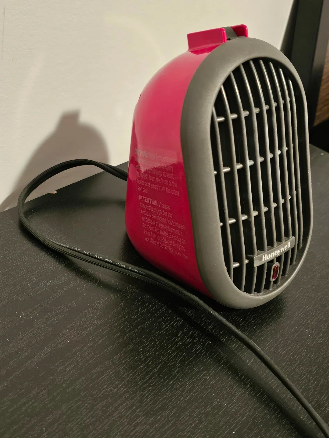 This is a Honeywell personal heater. It's a compact, pink and grey unit designed for personal spaces. Safety warnings are printed on the side.