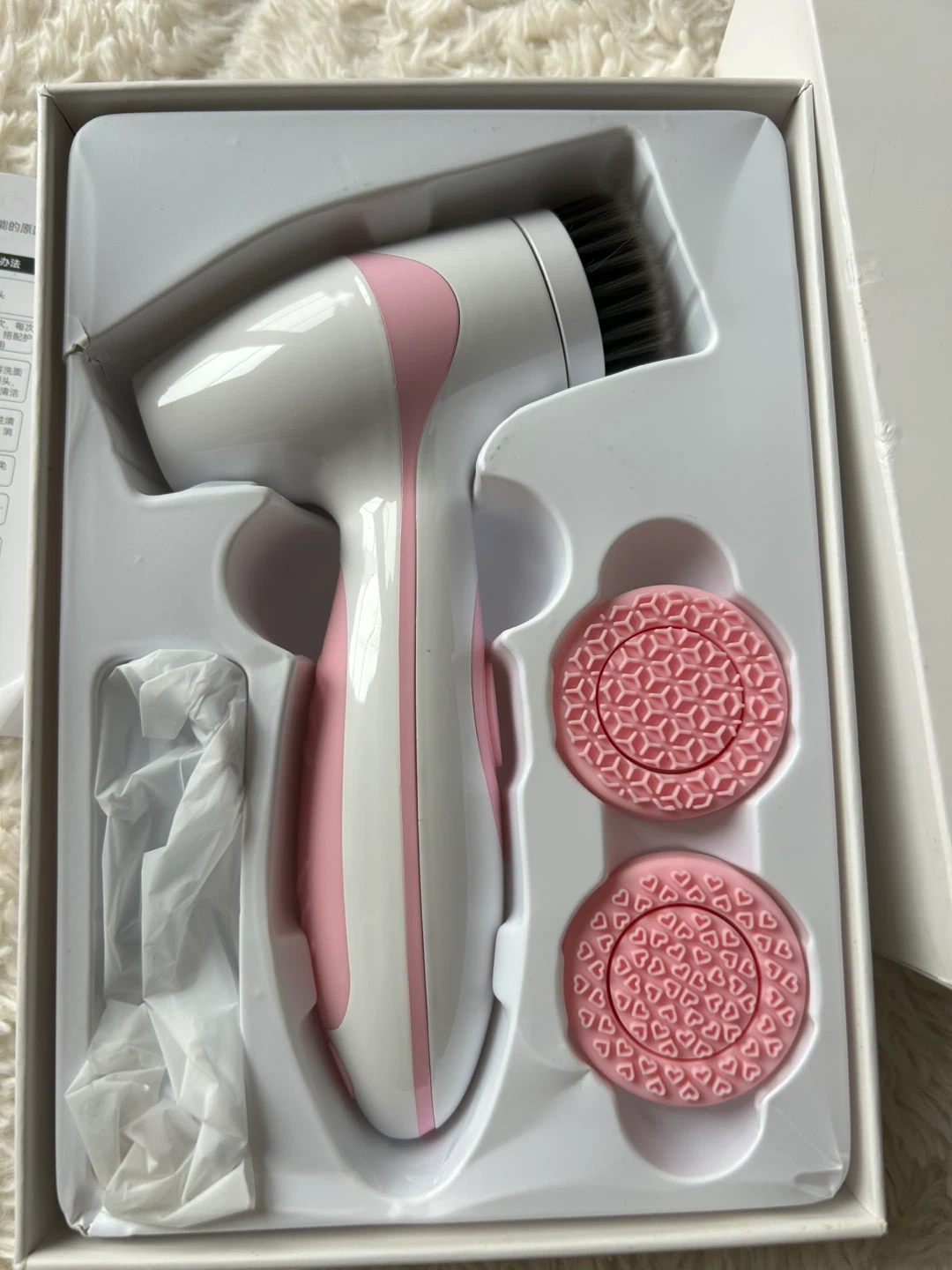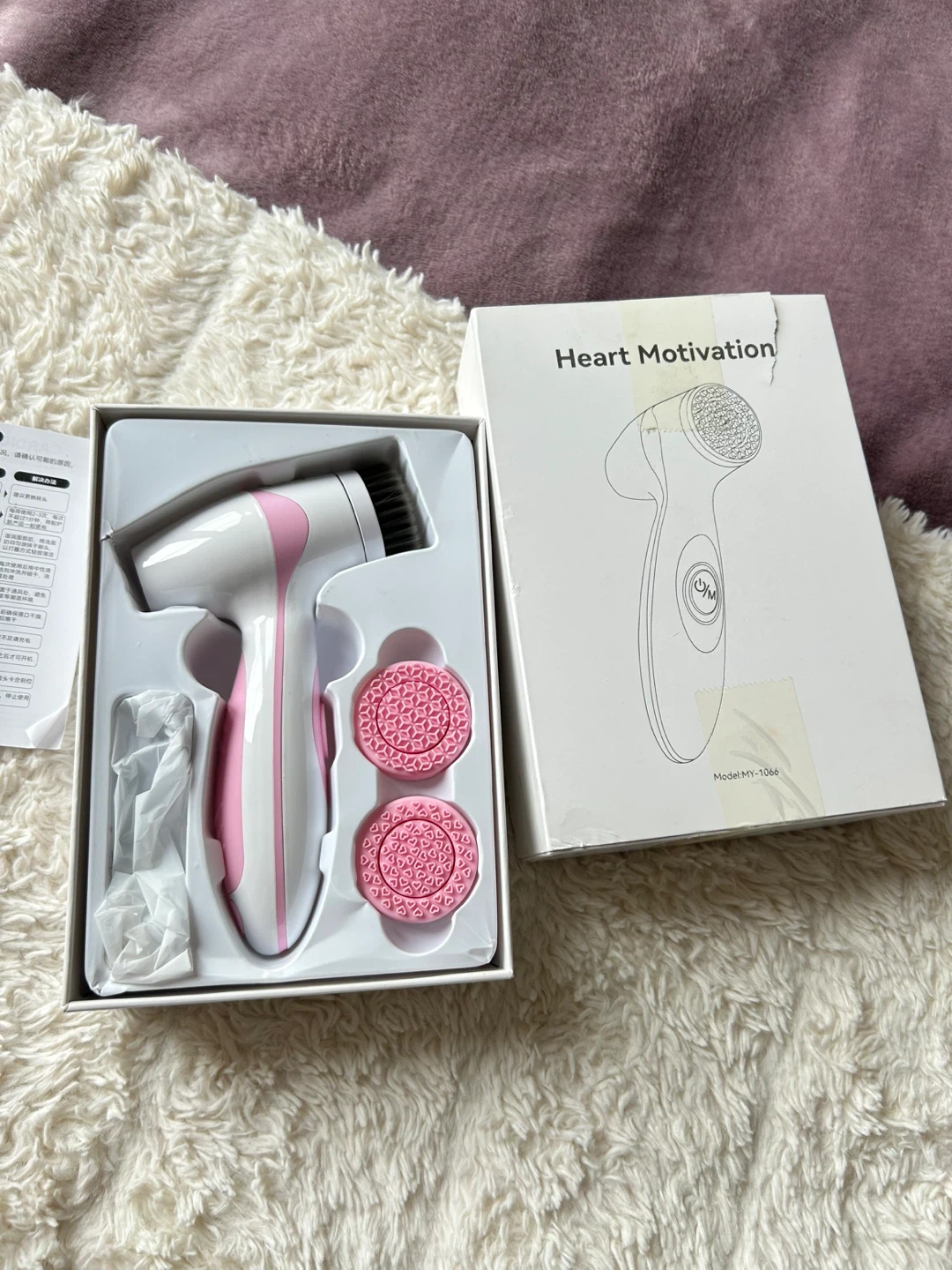 Heart Motivation facial cleansing device. It comes with the main unit, two interchangeable heads and charger. It's great for daily skincare routines!