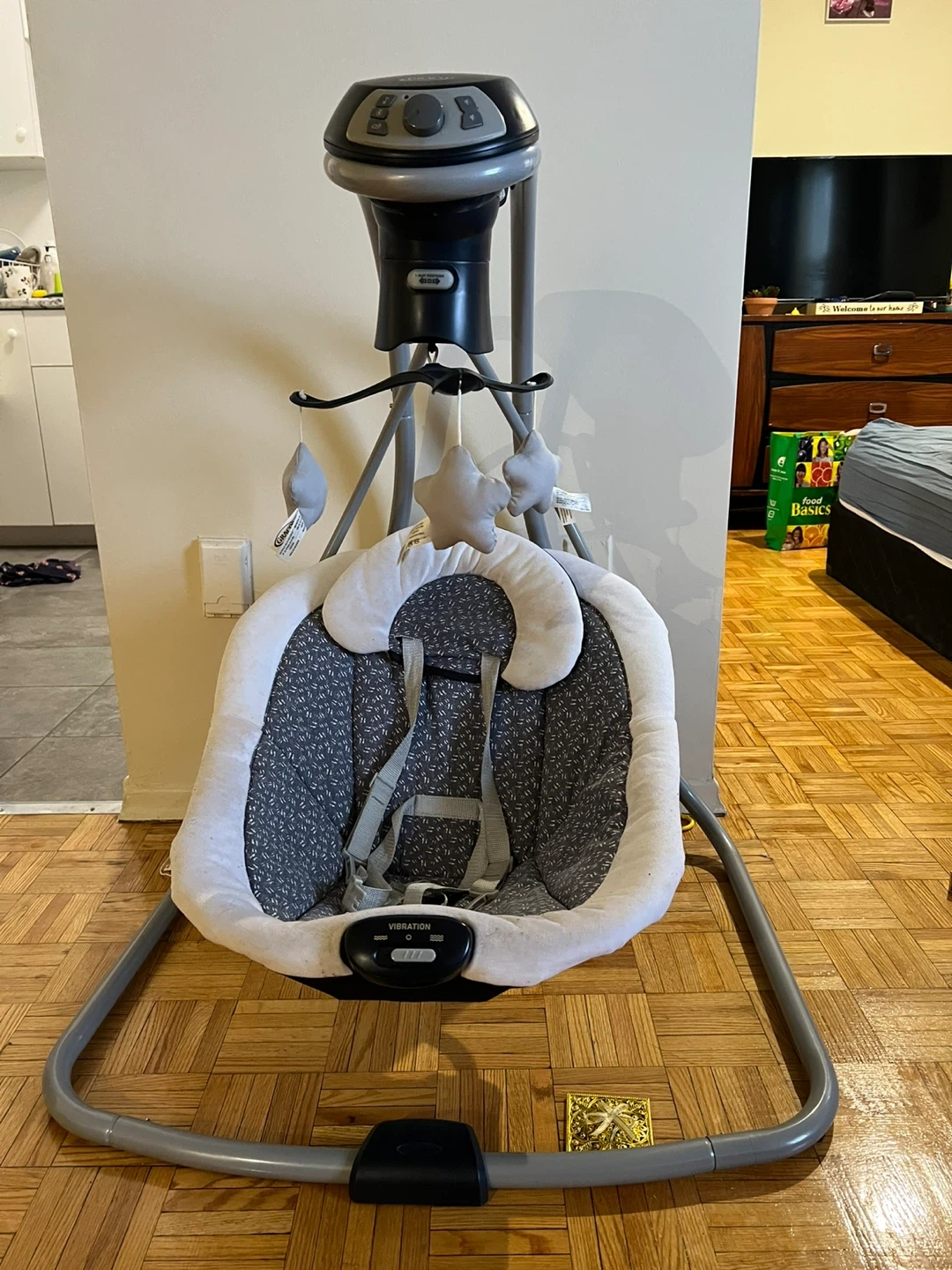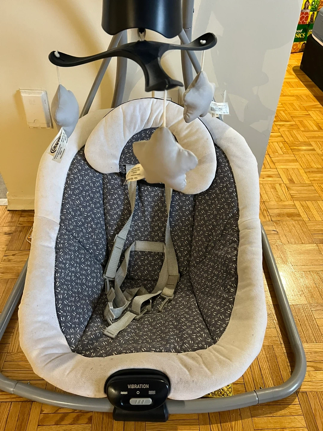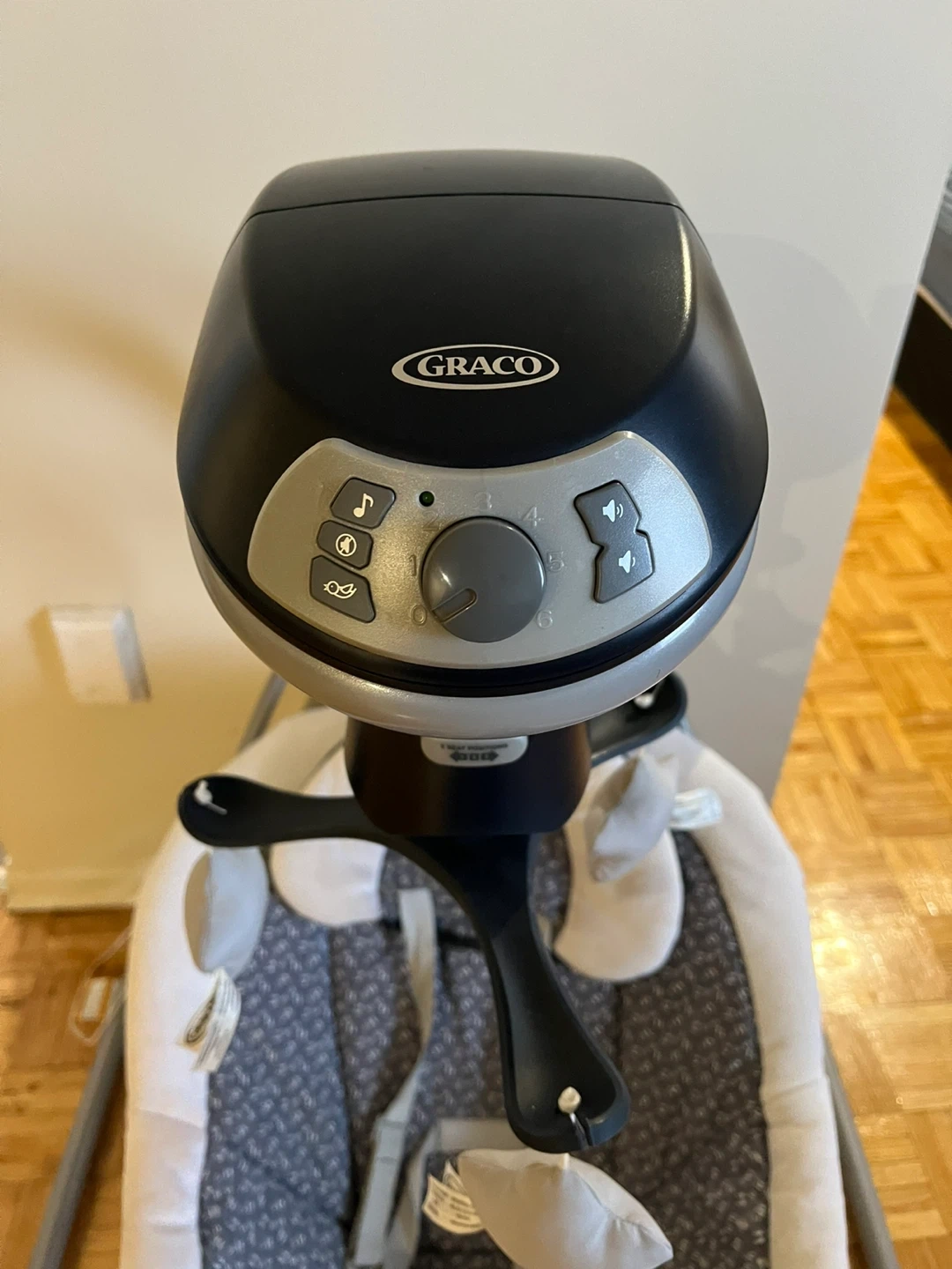 This is a Graco baby swing with multiple speeds and vibration settings. It has a comfortable padded seat and harness. Perfect for soothing little ones!